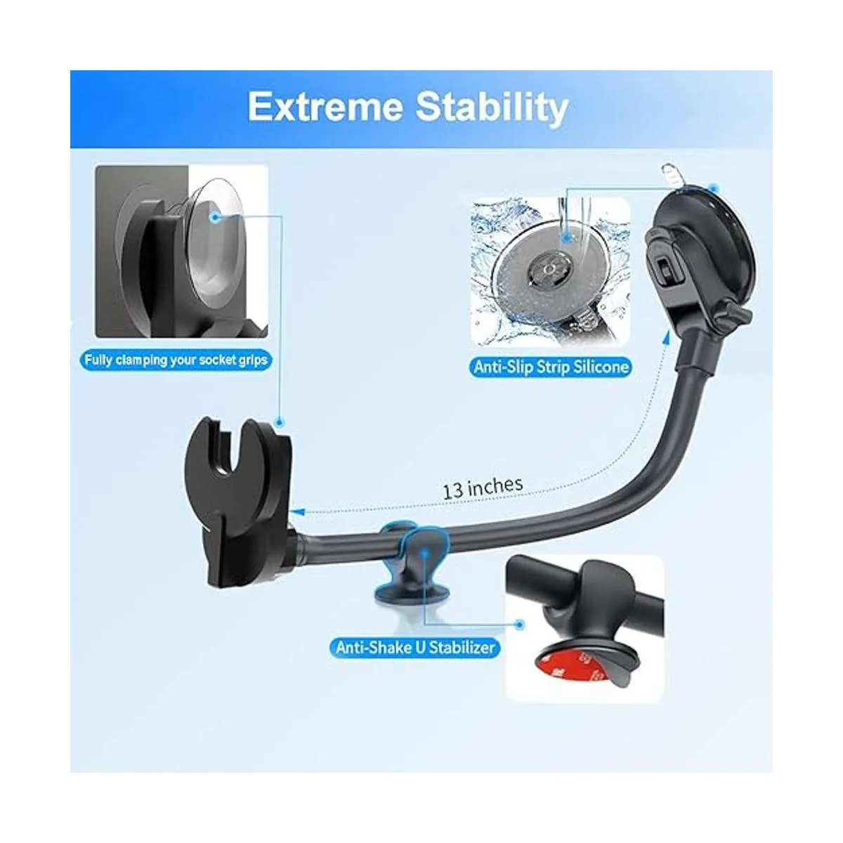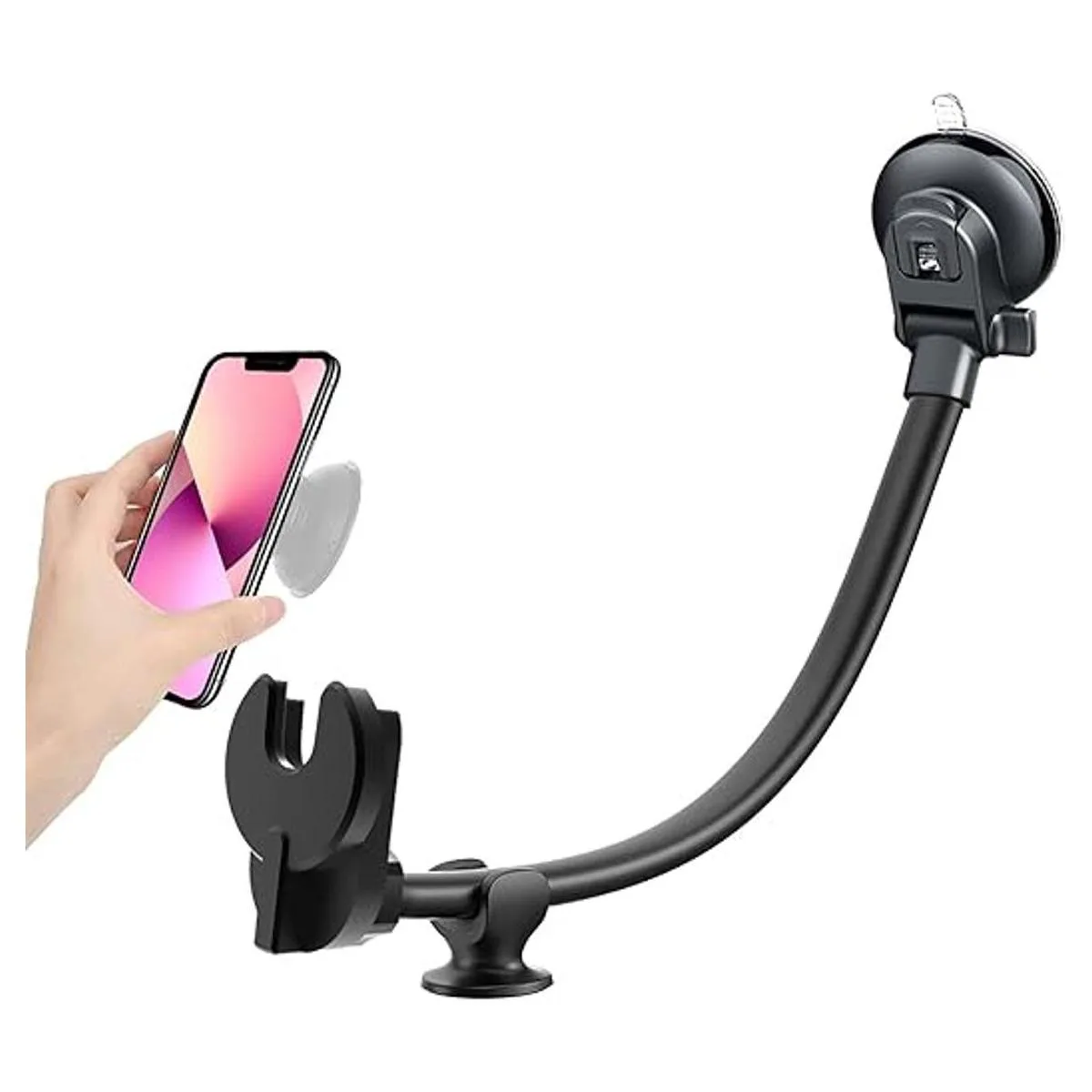 Soporte de teléfono para parabrisas de coche para usuarios de agarre plegable, brazo de 13 pulgadas de largo, cuello de cisne mejorado para soporte de agarre intercambiable, soporte para teléfono de salpicadero con ventosa fuerte