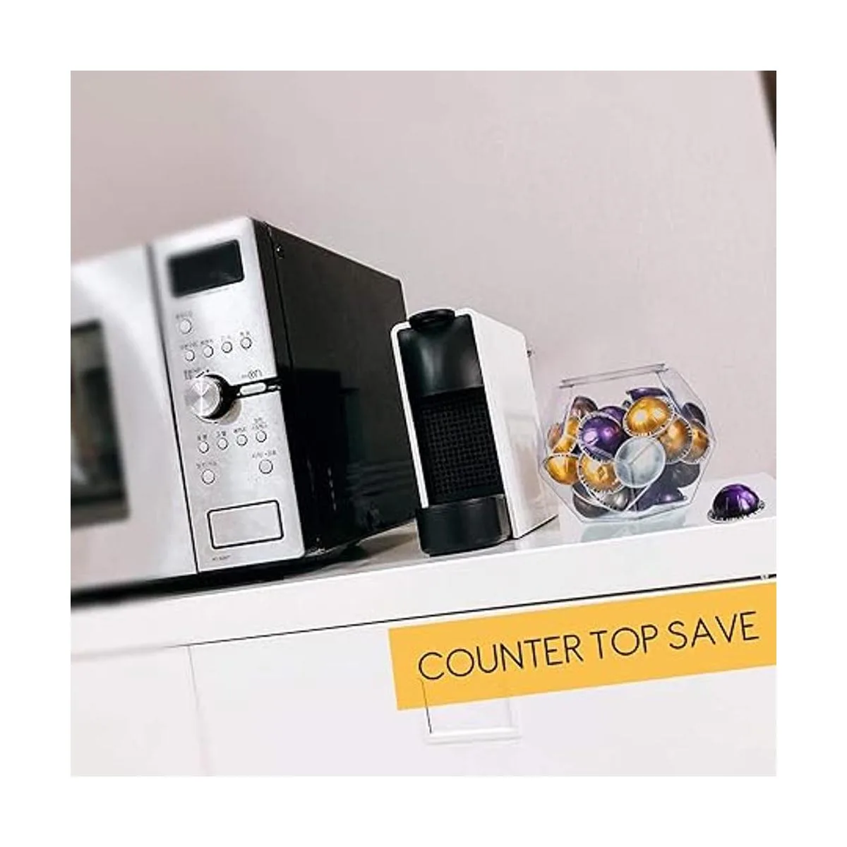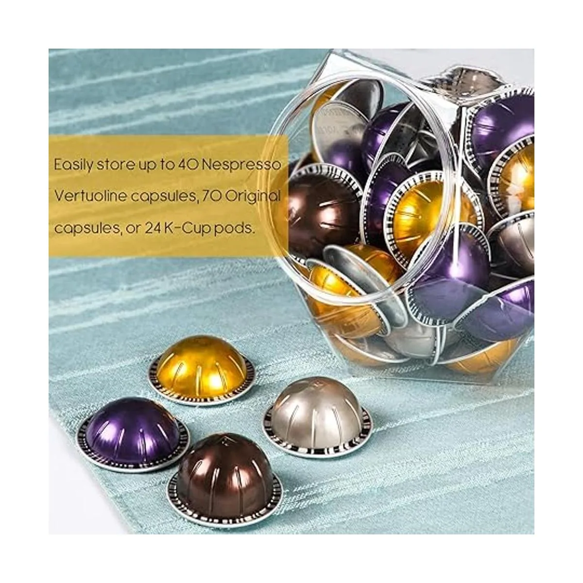 Gran capacidad: almacena fácilmente hasta 40 cápsulas Nespresso Vertuoline, 70 cápsulas originales o 24 cápsulas KCup Llega a través de la boca ancha para agarrar a tu favorito