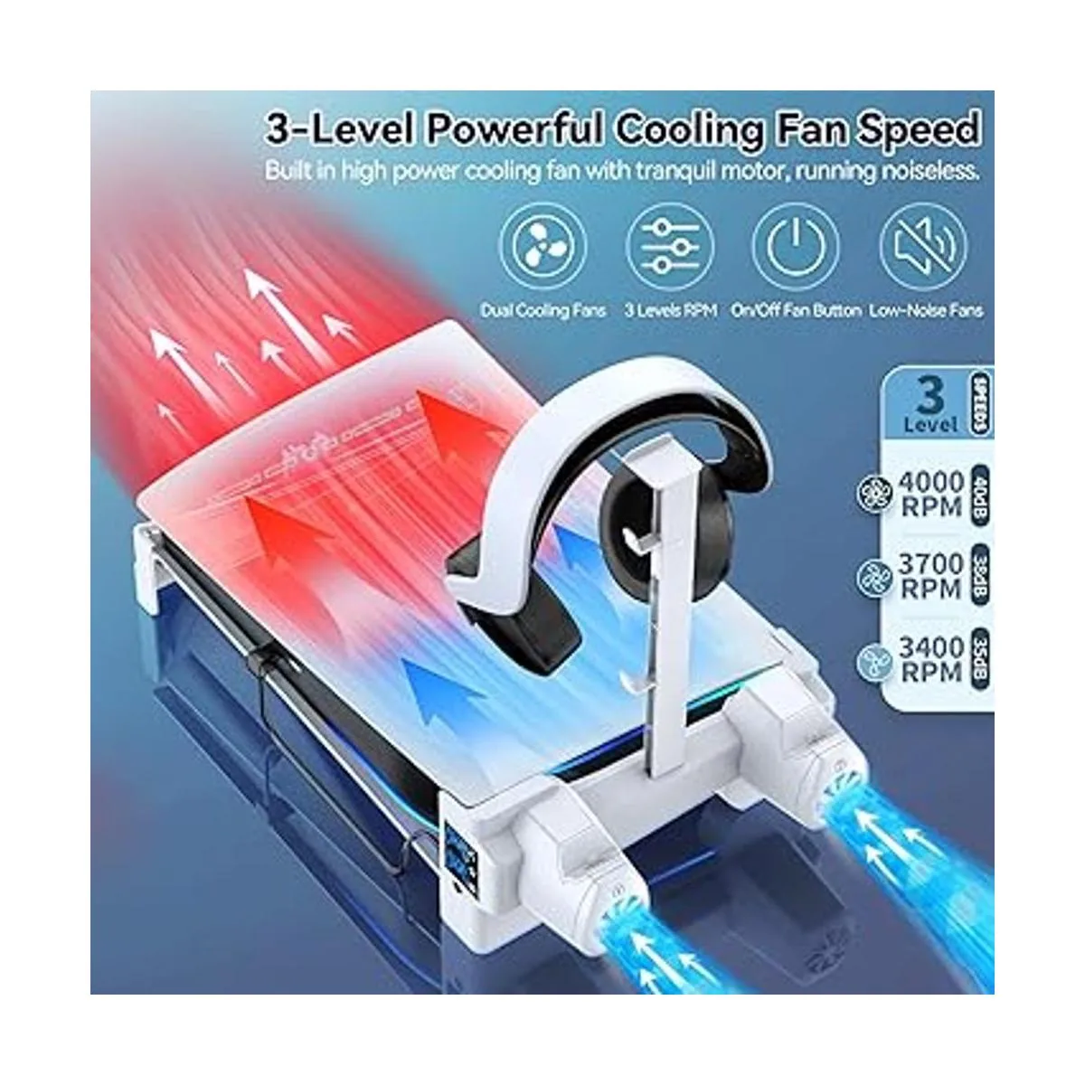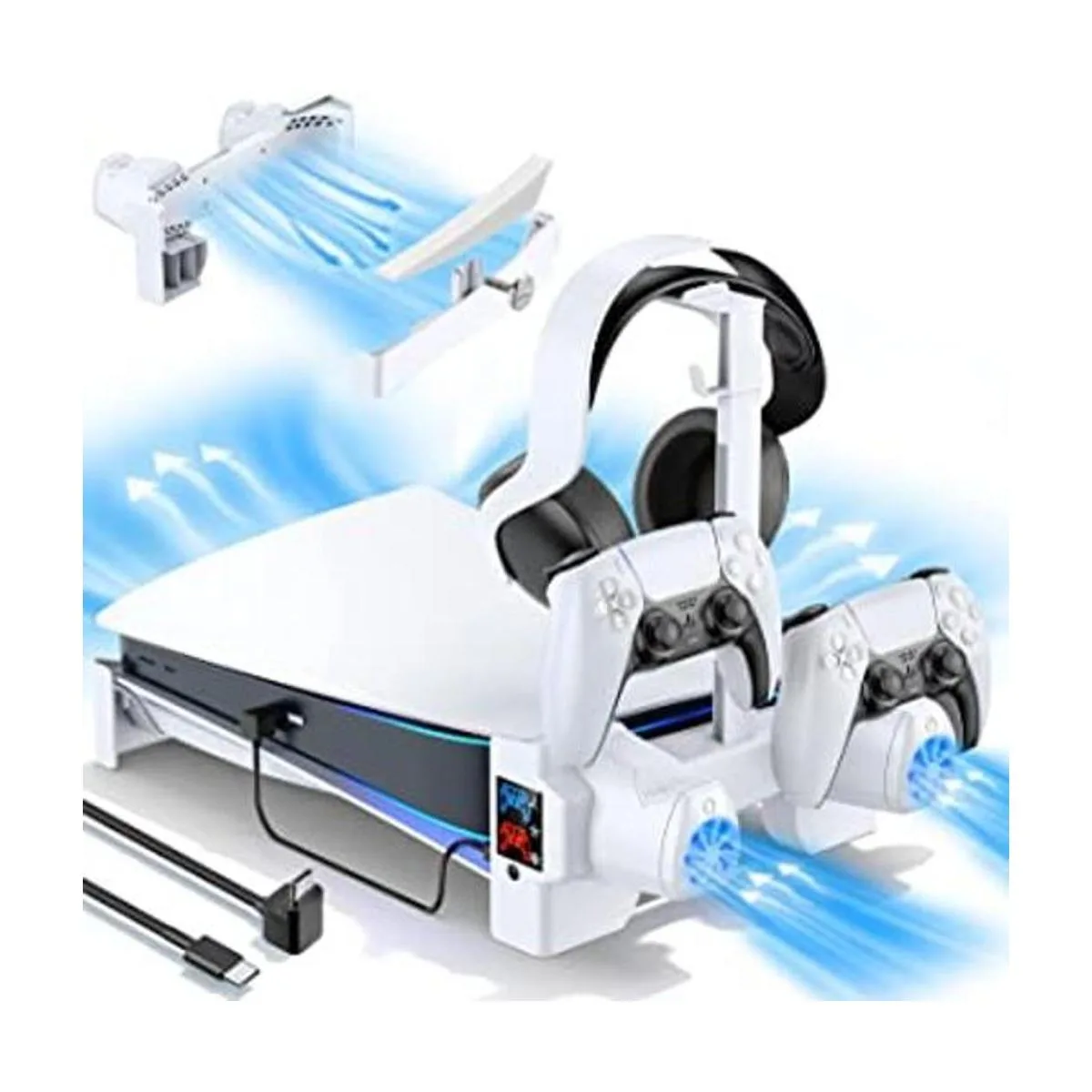 Soporte horizontal PS5 con ventiladores de enfriamiento de 3 niveles para consola Playstation 5, accesorios PS5 con cargador de controlador PS5, estación de refrigeración PS5 con soporte para auriculares y tornillo, cable USBC
