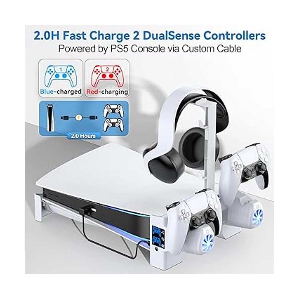 Di adiós a la colocación vertical No tienes suficiente espacio ni te preocupes por que tus mascotas se vuelquen sobre la consola Playstaion Five Console No te preocupes, el soporte horizontal PS5 almacenará de forma estable tus accesorios PS5 y mantendrá todas las cosas de PS5 organizadas. La estación organizadora PS5 elimina el área de juego desordenada, carga 2 controladores PS5 mientras enfría el sistema PS5 con velocidades de ventilador ajustables a través de controles de interruptor táctil. Si la altura lo permite, es conveniente almacenar tus auriculares PS5 con soporte para auriculares.