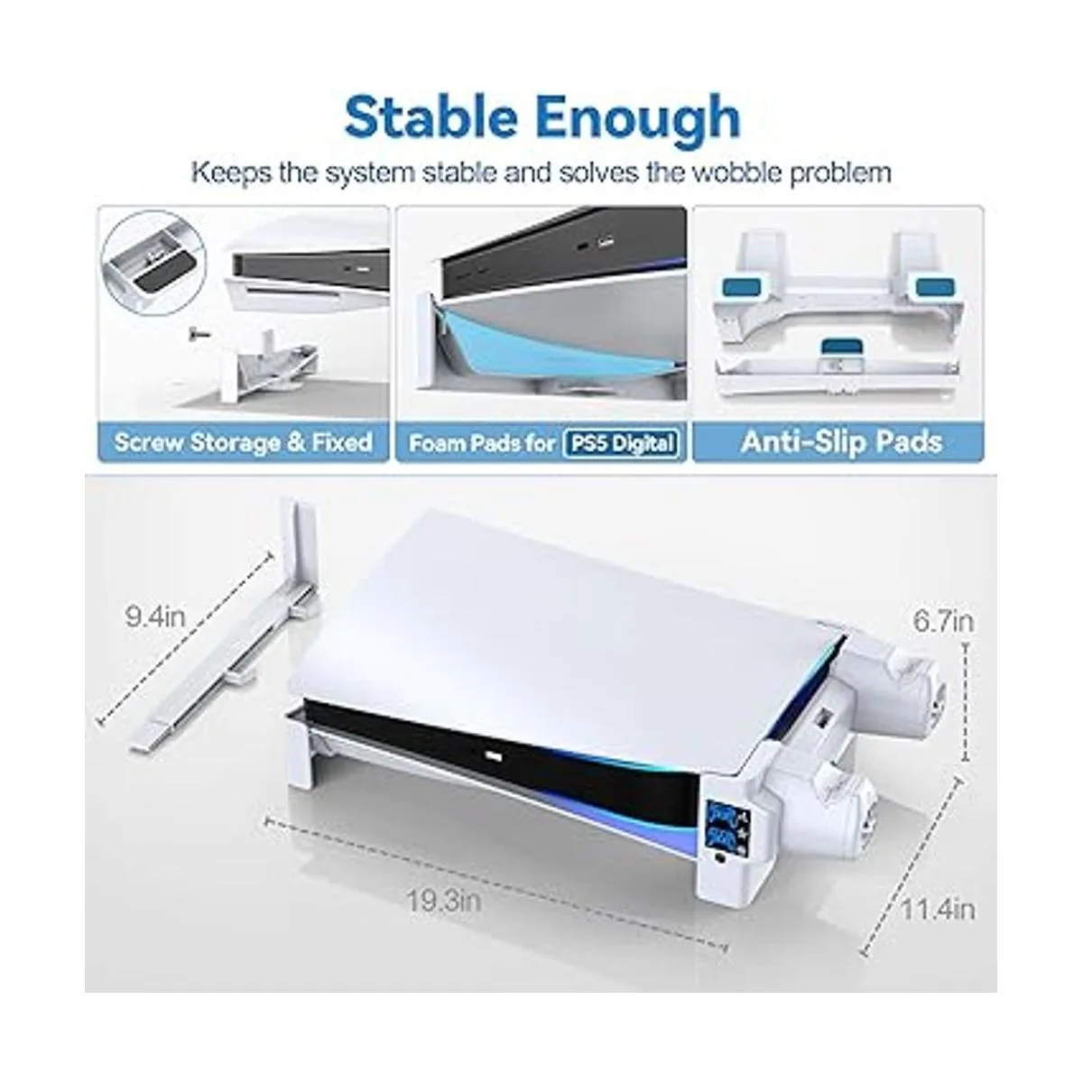 Lo suficientemente estable con tornillo de seguridad El soporte de refrigeración PS5 viene con un tornillo de seguridad para estabilizar la PS5 mientras resuelve el problema de tambaleo. El soporte de refrigeración horizontal PS5 está equipado con almohadillas antideslizantes en la parte inferior para evitar cualquier golpe accidental. El soporte PS5 es para consola PS5 Disc y PS5 Digital Edition de la que la almohadilla de espuma dentro del paquete es para consola digital PS5. Al colocar nuestra estación de refrigeración para consola PS5, mide 19.3 x 11.4 pulgadas y 6.7 pulgadas de alto cuando se carga 2 controladores PS5.