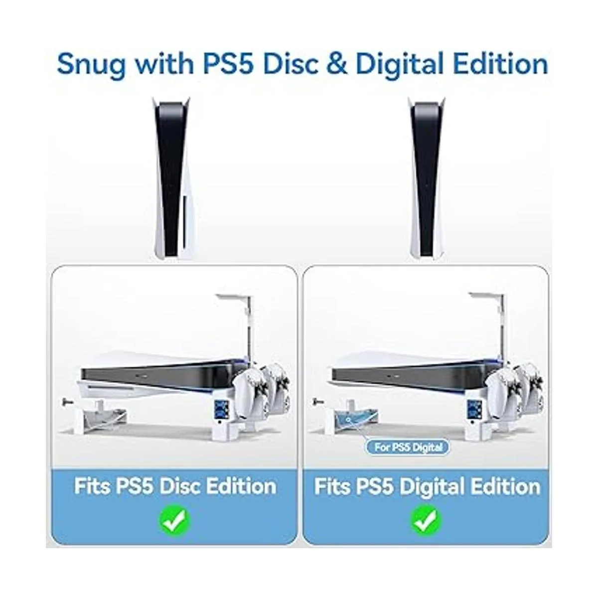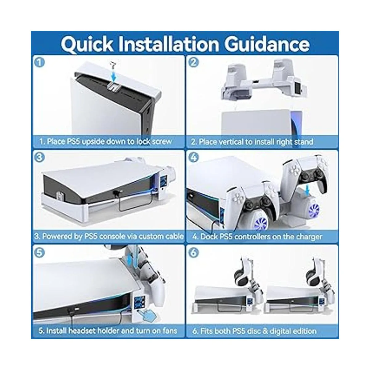 Disco PS5 fácil de instalar y versión digital: simplemente bloquea el soporte izquierdo y la base de la consola con el tornillo proporcionado del que la almohadilla de espuma está diseñada para la versión digital PS5 para poner en el soporte izquierdo. A continuación, sujeta el soporte derecho a la consola PS5 e inserta el soporte para auriculares. El cable especial se conecta a la parte delantera de la estación de refrigeración PS5 para obtener la alimentación de 2 controladores. Cuando se complete la instalación, simplemente enciende la consola PS5 y empieza a usar.