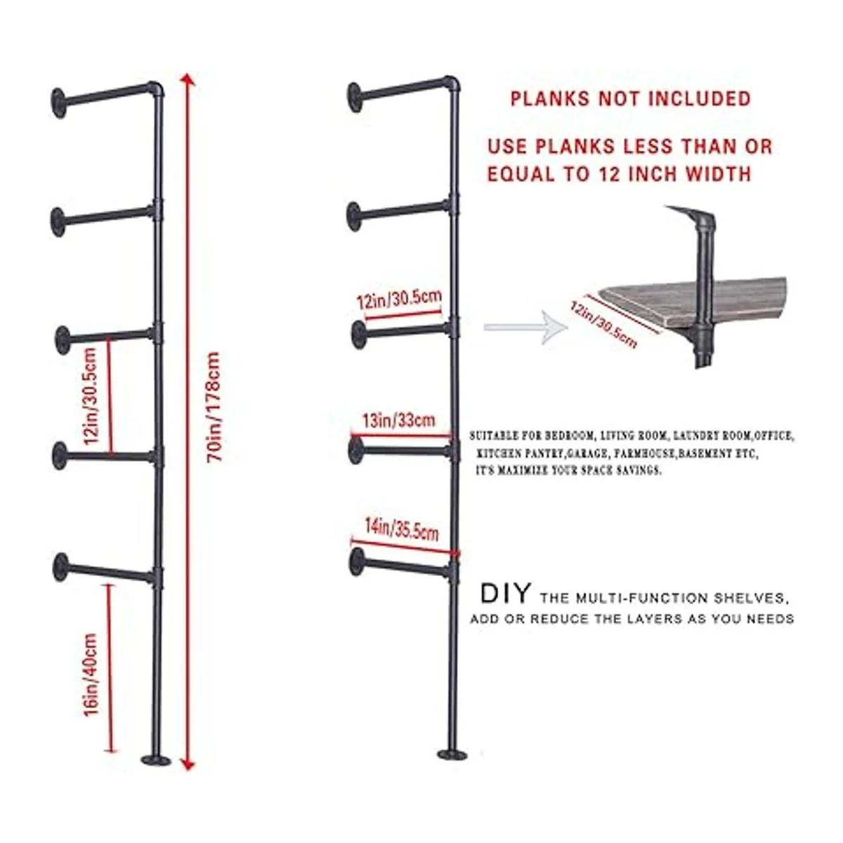 Dimensiones: 70 pulgadas de alto, 5 niveles, aproximadamente 11 pulgadas entre cada nivel excluyendo camisetas, codos; profundidad 12 pulgadas sin posición de tornillo; diámetro del tubo de 3/4 pulgadas; 12 bridas, 2 codos, 8 tees. Se recomienda que el ancho de la tabla sea inferior o igual a 12 pulgadas y la longitud de la tabla sea inferior a 60 pulgadas.