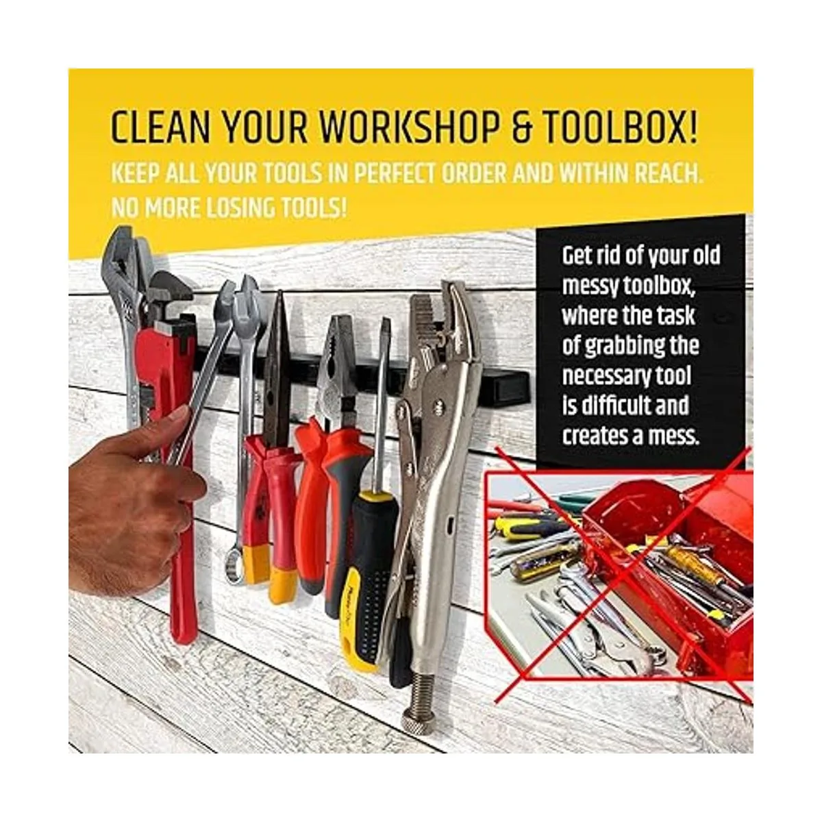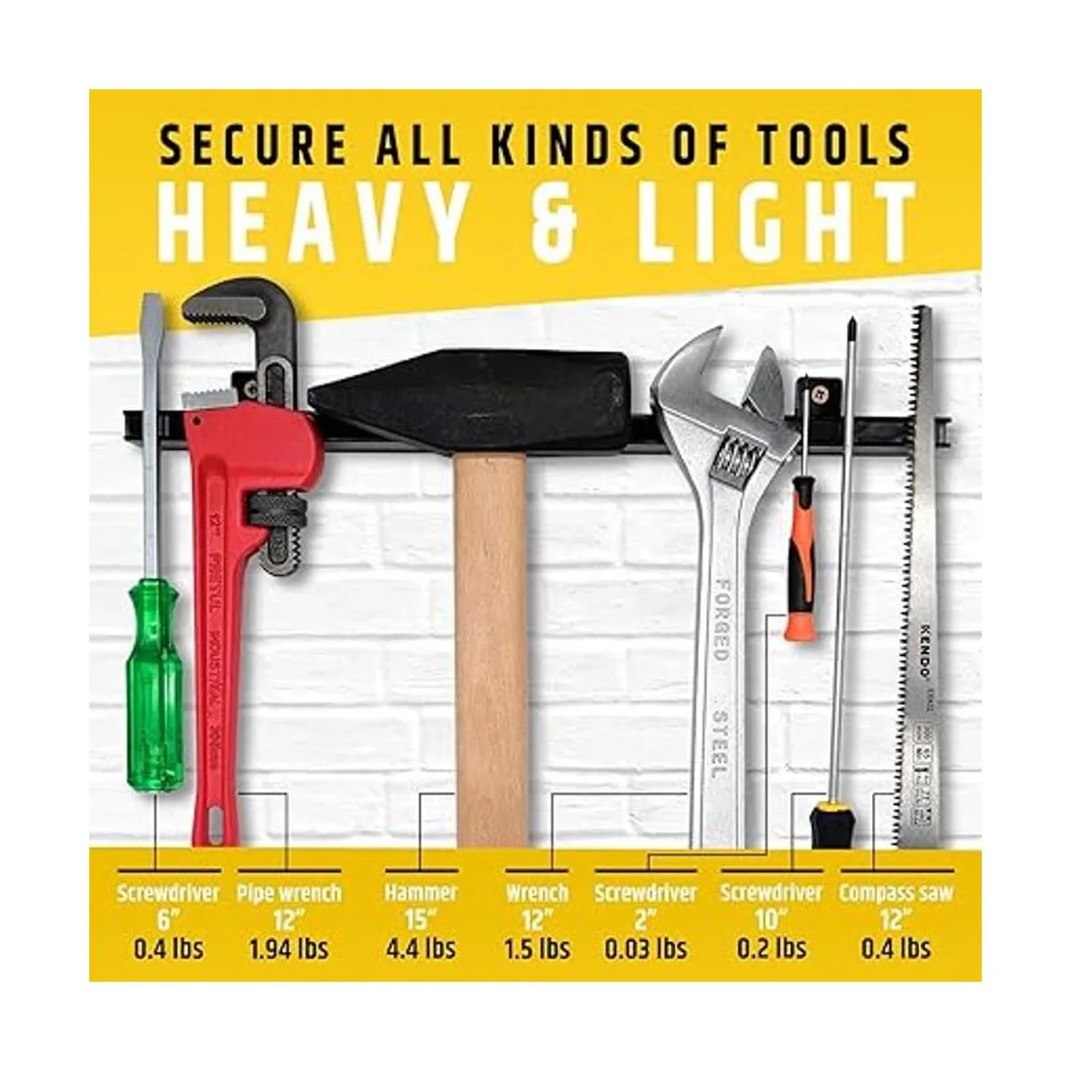 Asegura cualquier tipo de herramienta: esta tira magnética larga para herramientas está diseñada específicamente para sostener cualquier juego de herramientas firmemente, sin deslizarse ni cambiarse, ni siquiera un toque de tambaleo Nuestra barra magnética está calibrada para sujetar de forma segura herramientas de muchos pesos con facilidad. Estamos encantados de proporcionar un almacenamiento seguro sin preocupaciones para martillos, alicates, llaves, cortadores de alambre, destornilladores, cinta métrica, hachas y cualquier otra herramienta que puedas tener, desde las herramientas más grandes, pesadas hasta las más pequeñas y ligeras.