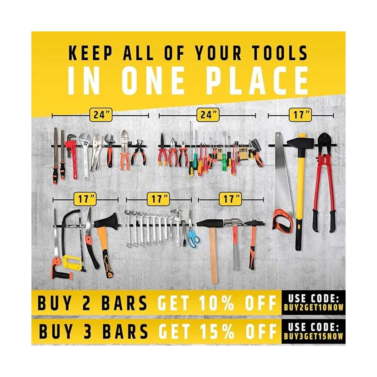 Imanes extra resistentes: te ofrecemos un soporte magnético para herramientas de 24 pulgadas, ahora incluye imanes resistentes que nunca perderán su fuerza magnética. Esta actualización te proporciona una barra de herramientas magnética de alta calidad que sostiene cualquier juego de herramientas de forma segura y al alcance de la mano. Nuestro imán elegido tiene una fuerza magnética uniformemente extendida en toda la barra, lo que te permite utilizar de forma segura toda la longitud de 24 pulgadas. El agarre magnético es muy potente, pero solo se necesita un tirón suave para liberar cualquier herramienta para su uso.