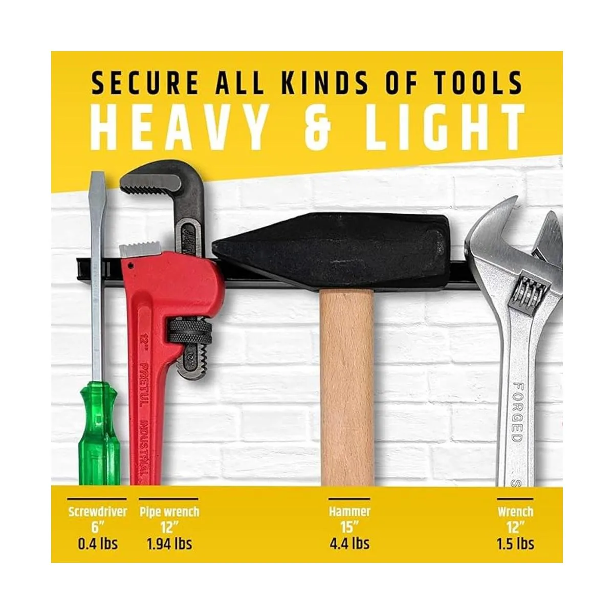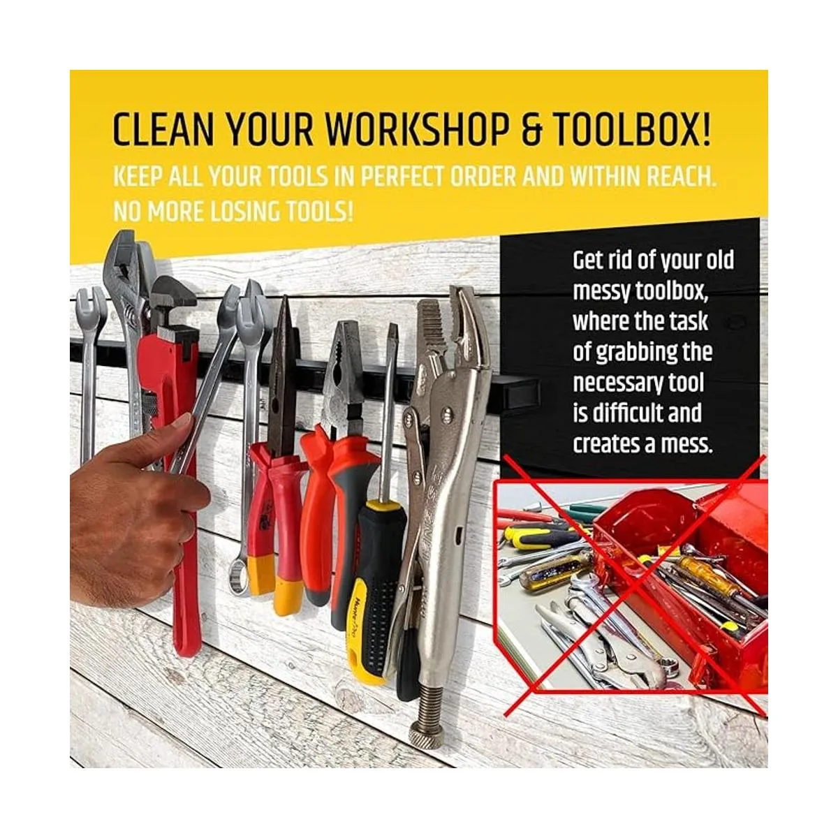 Asegura cualquier tipo de herramienta: esta tira magnética larga para herramientas está diseñada específicamente para sostener cualquier juego de herramientas firmemente, sin deslizarse ni cambiarse, ni siquiera un toque de tambaleo Nuestra barra magnética está calibrada para sujetar de forma segura herramientas de muchos pesos con facilidad. Estamos encantados de proporcionar un almacenamiento seguro sin preocupaciones para martillos, alicates, llaves, cortadores de alambre, destornilladores, cinta métrica, hachas y cualquier otra herramienta que puedas tener, desde las herramientas más grandes, pesadas hasta las más pequeñas y ligeras.