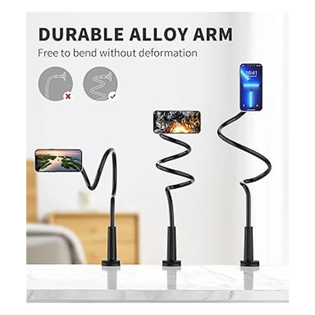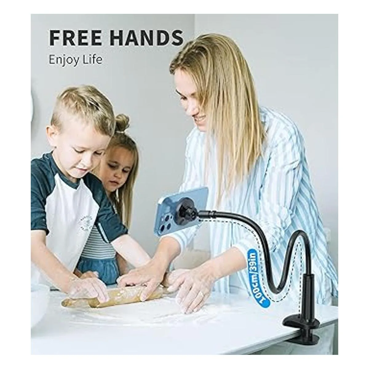 Soporte multiusos para teléfono: experiencia con una sola mano que incluye: ver videos mientras comes, tumbado en la cama/sofá, ciclismo, cocinar, trabajar en el escritorio, grabar y revisar rápidamente al filmar videos, ángulo de cámara superior, etc. Nuestra base de abrazadera más ancha mejorada se puede montar de forma segura en un escritorio, marco de cama, mesita de noche, cabecero, mango de bicicleta interior, mostrador y mucho más. El soporte magnético permite ángulos de visión ilimitados para más flexibilidad mientras que la silicona antideslizante protege tus muebles.