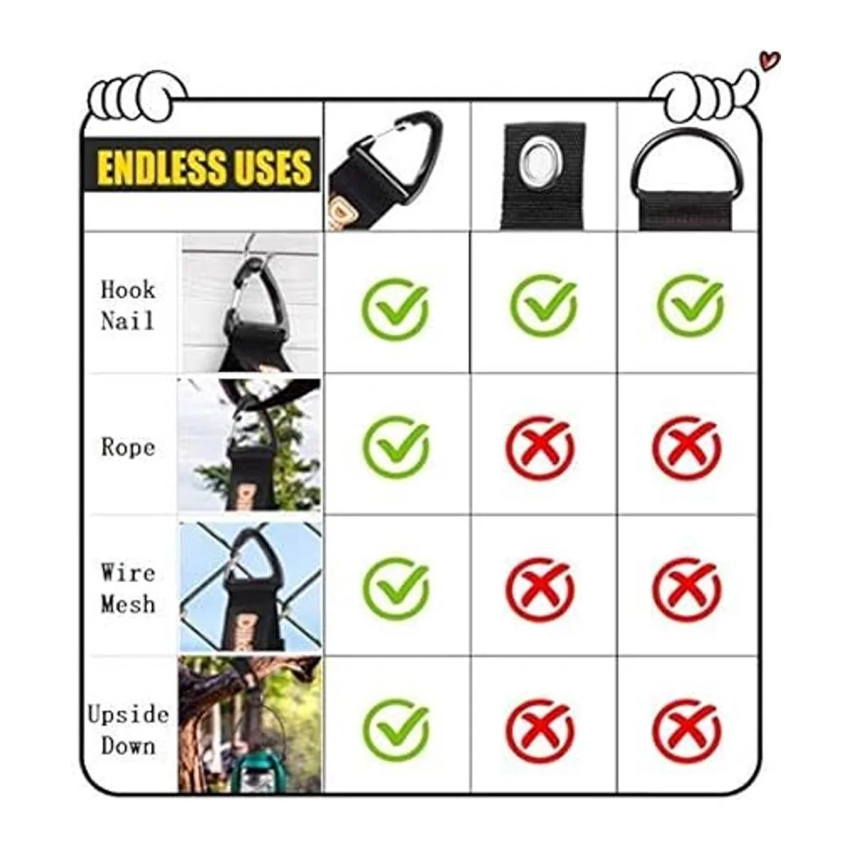 Capacidad de carga resistente 50 libras: nuestra correa de almacenamiento está fabricada con una mezcla perfecta de material de nailon de alta densidad de calidad superior y clip triangular a prueba de óxido, que ofrece una excelente capacidad de carga. Con una capacidad de sujeción de 50 libras, sigue adelante y cuelga tus herramientas pesadas también