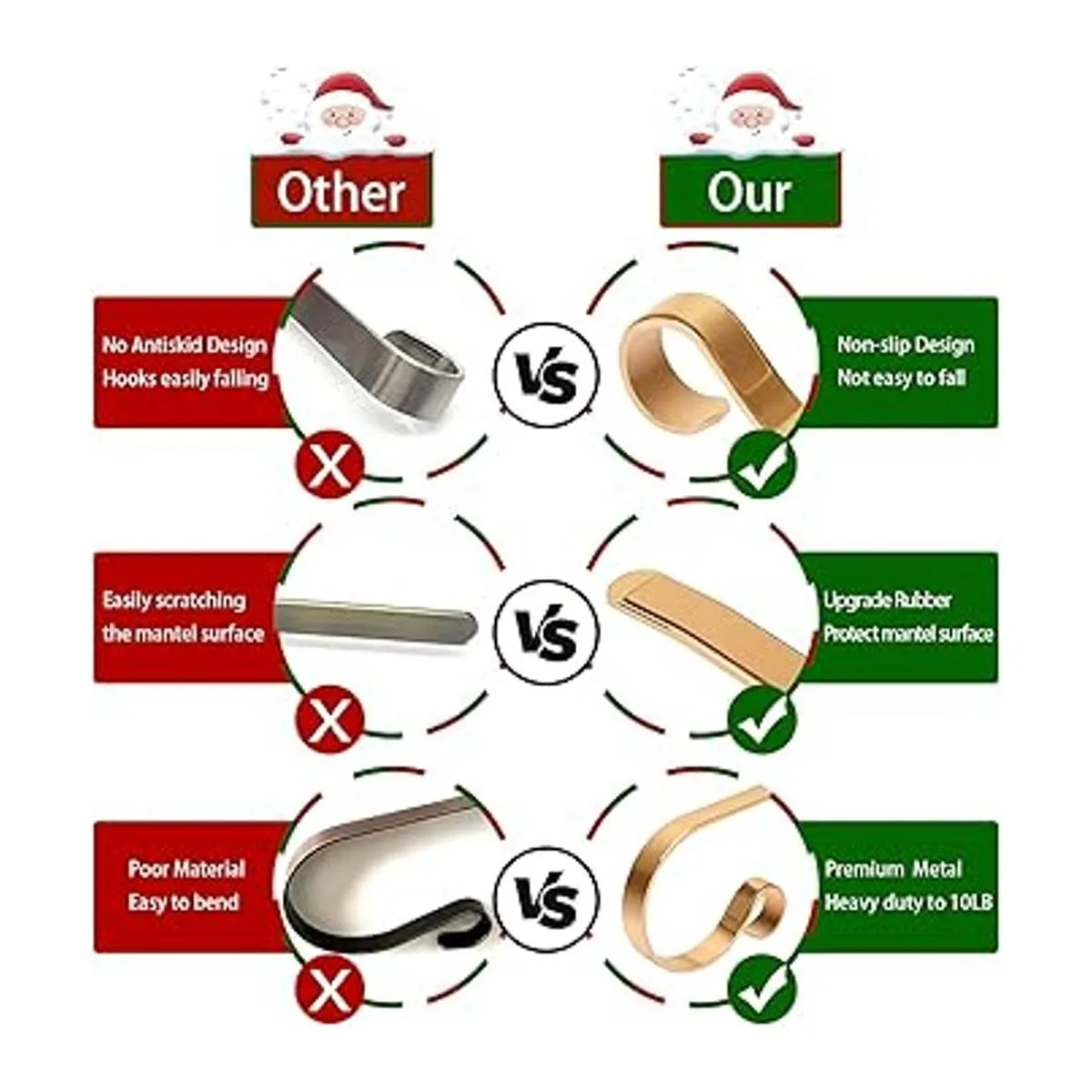 Soporte antideslizante para calcetines de Navidad: nuestros soportes para calcetines sin daños con diseño antideslizante. Cada soporte para calcetines de Navidad tiene dos piezas de tira de goma dentro de la parte superior e inferior, en donde los ganchos de Navidad tocan la chimenea, que está equipado para proteger la superficie de tu chimenea o mesa de arañazos, también evita que se deslice. Nuestros soportes de Navidad para repisa pueden colgar firmemente tus decoraciones de Navidad sin caídas ni daños