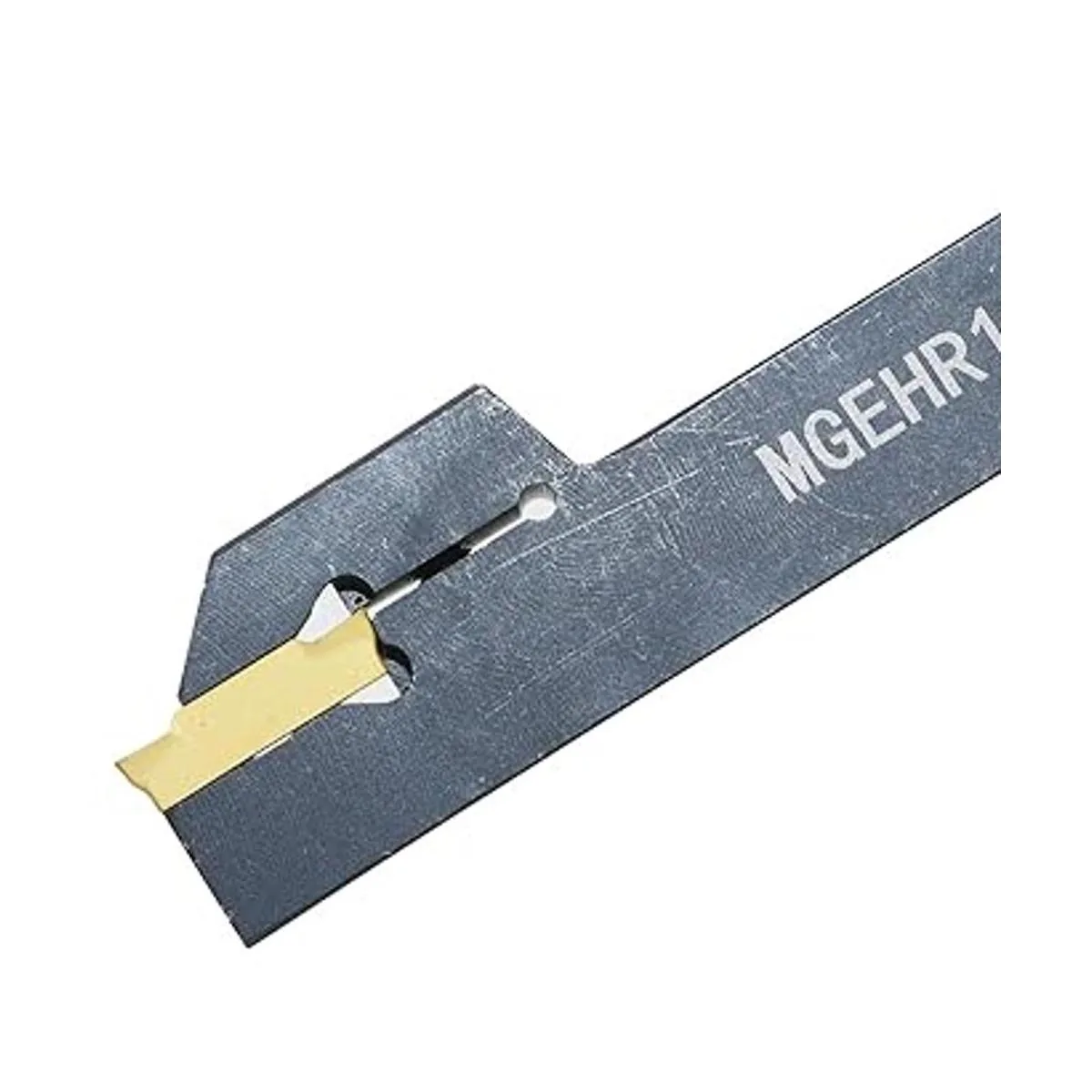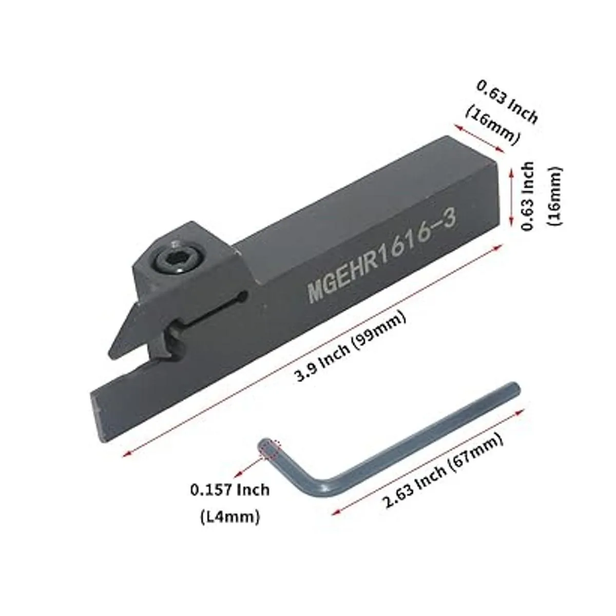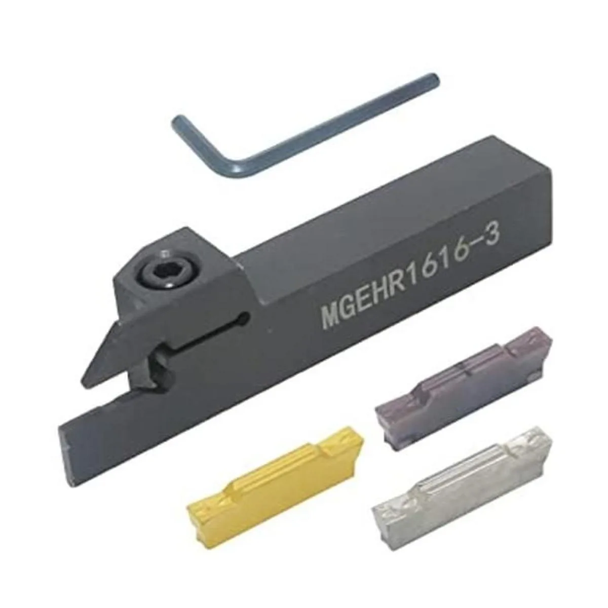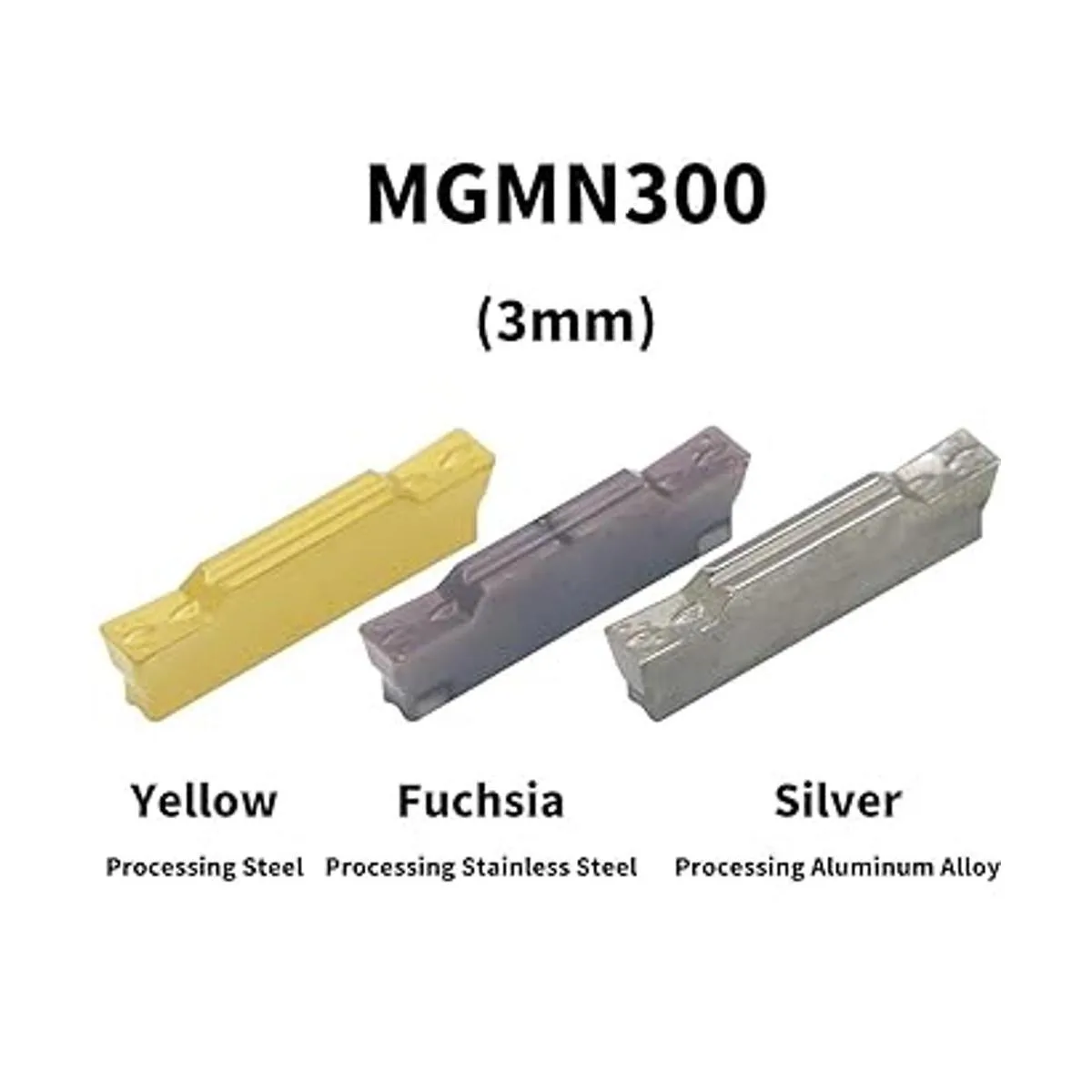 Soporte para herramientas de ranurado de torno CNC MGEHR16163 0.63 pulgadas, con tres cuchillas de carburo cementado MGMN300. Acero procesado amarillo, acero inoxidable procesado fucsia, aleación de aluminio procesado en plata. 0.118 in