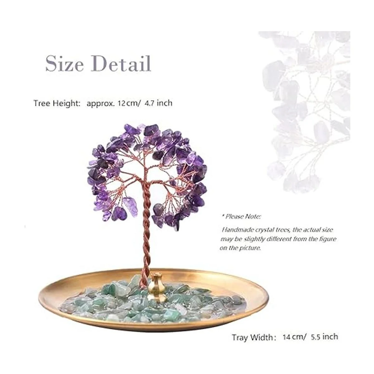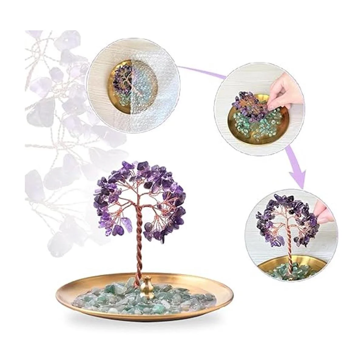 Material: cristales morados naturales seleccionados a mano en el árbol, mini estanque artificial en bandeja redonda de metal.