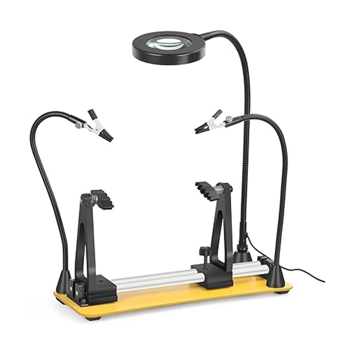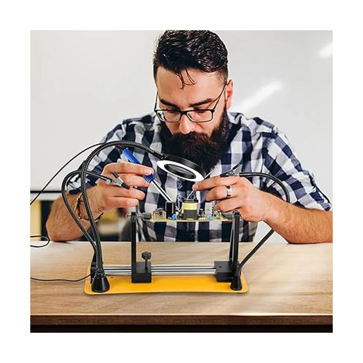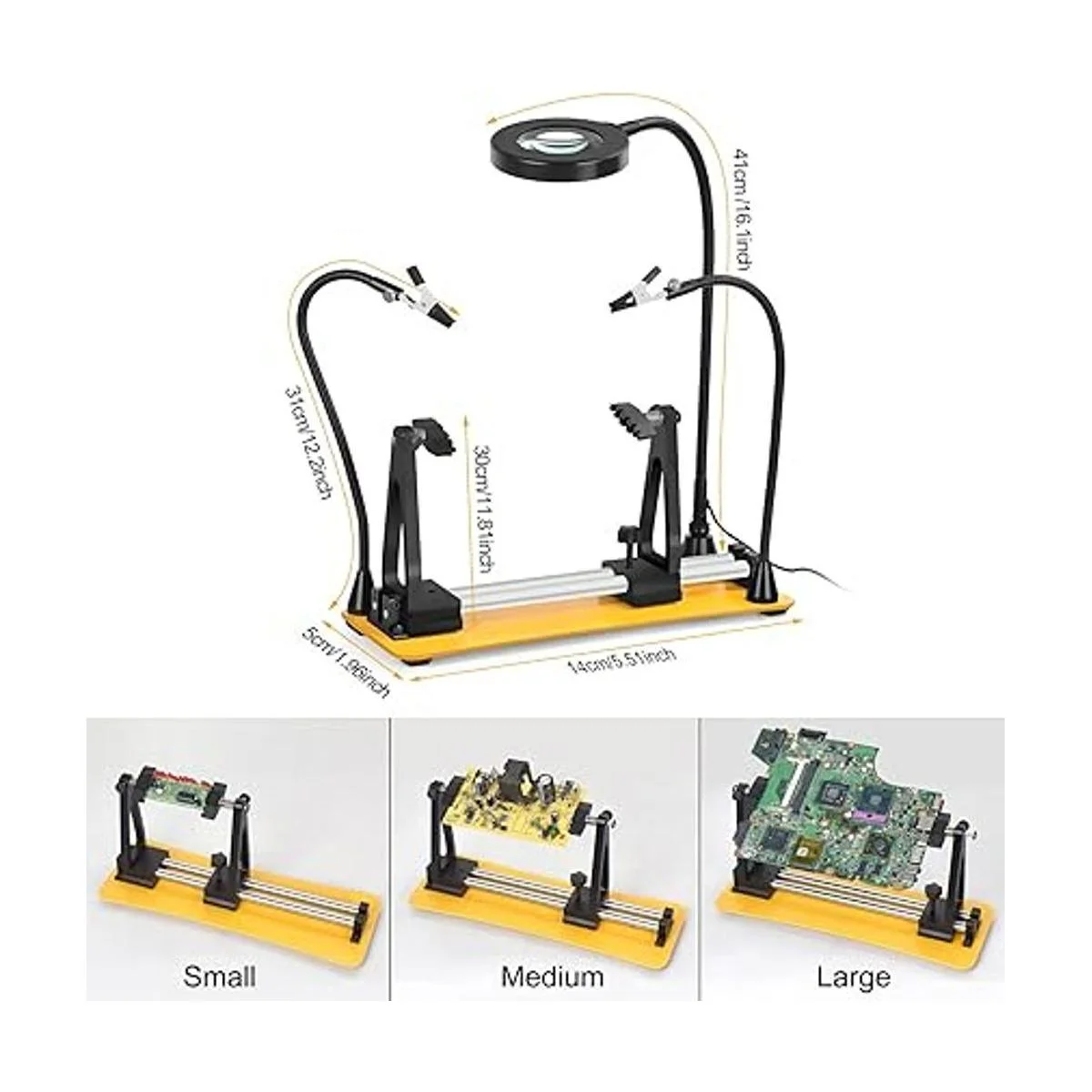 Soporte para placa de circuito: el soporte de placa de circuito con 2 brazos L12.2 pulgadas y una lámpara de aumento, la lámpara con 42 luces LED de 5 W, 3 modos de color blanco, cálido, frío y atenuación continua. Puede girar fácilmente placas de circuito de 360 grados.