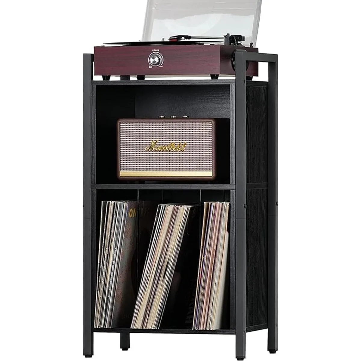 Amplio espacio de almacenamiento: el soporte para tocadiscos de diseño vertical de 3 niveles puede contener hasta 100 discos de vinilo. El armario de tocadiscos tiene un segundo nivel espacioso para satisfacer tus diferentes necesidades de almacenamiento y puede almacenar aperitivos, latas o audio y otros equipos. El diseño recortado de los agujeros redondos en el panel trasero te permite pasar fácilmente cables para conectar al dispositivo. Dimensiones del producto: 11.48 x 15.75 x 28.35 pulgadas.