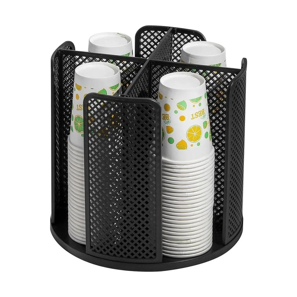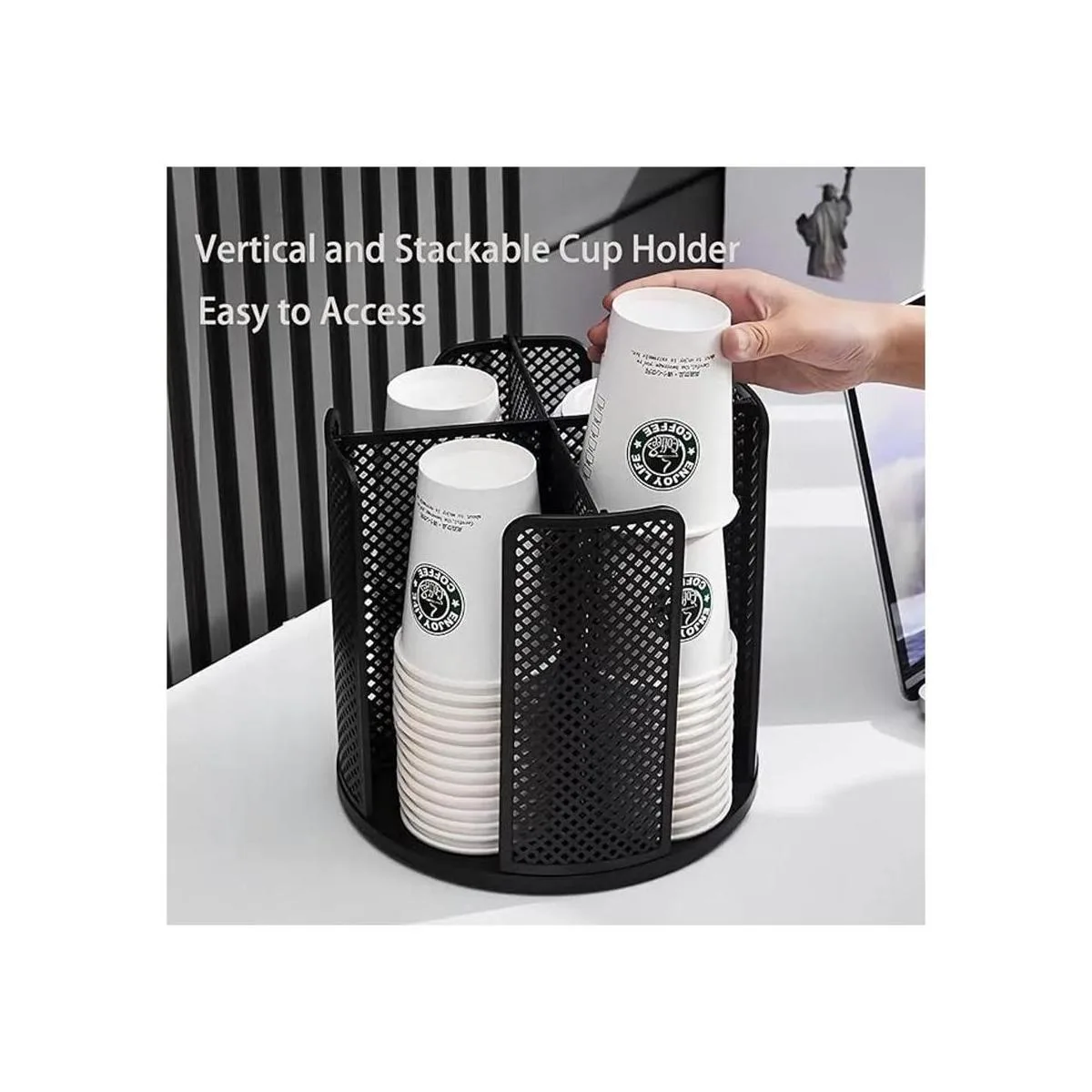 Capacidad de almacenamiento perfecta: el portavasos de papel es un organizador de almacenamiento de gran capacidad. Este soporte mide 9.25 x 9.25 x 8.7 pulgadas con 4 compartimentos de malla que pueden apilar y almacenar más tazas y tapas.