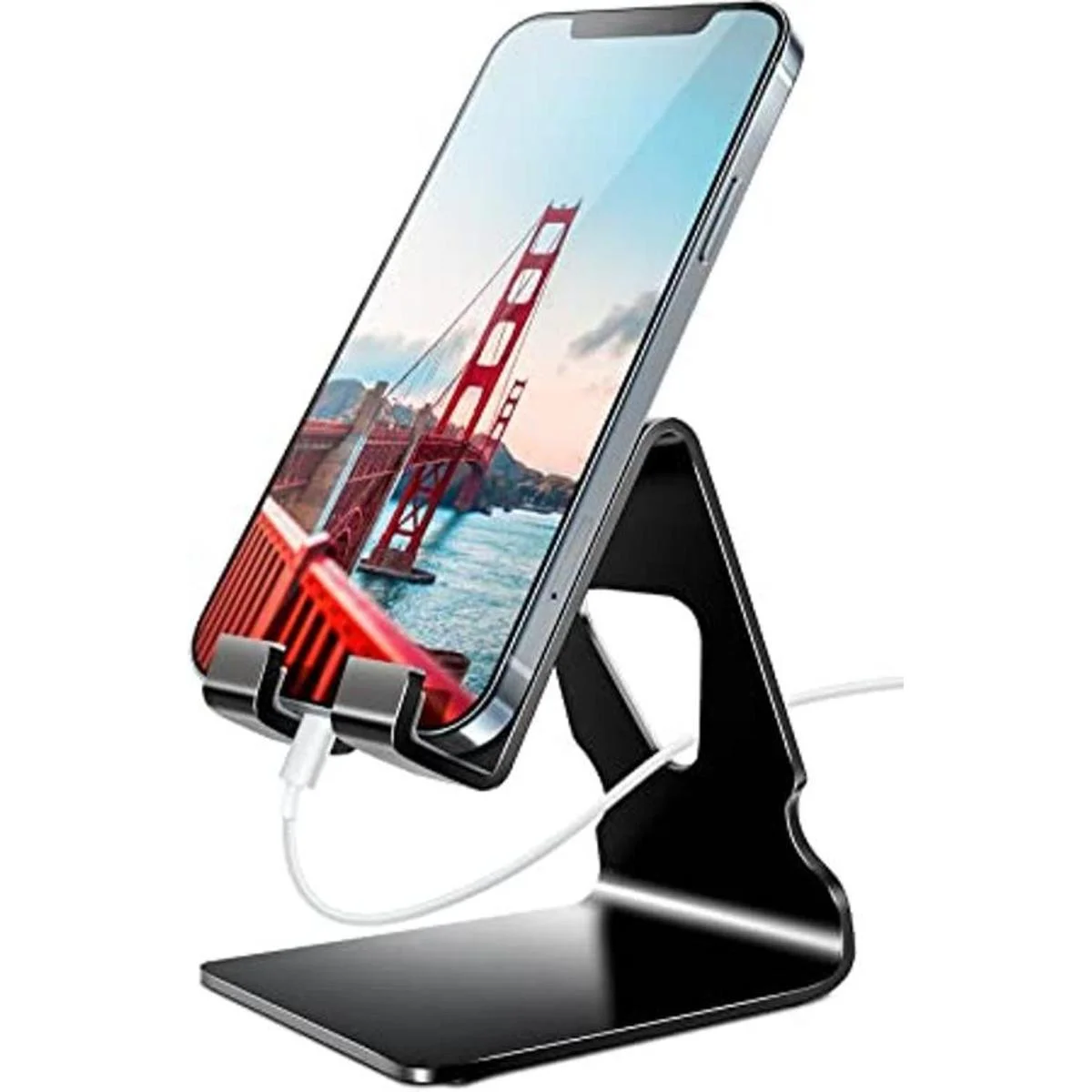 Soporte para teléfono celular, base para teléfono, cuna, soporte, soporte de aluminio para teléfono celular de escritorio con cable colectivo para escritorio de oficina, mesita de noche compatible con iPhone 14 13 Pro Max, negro