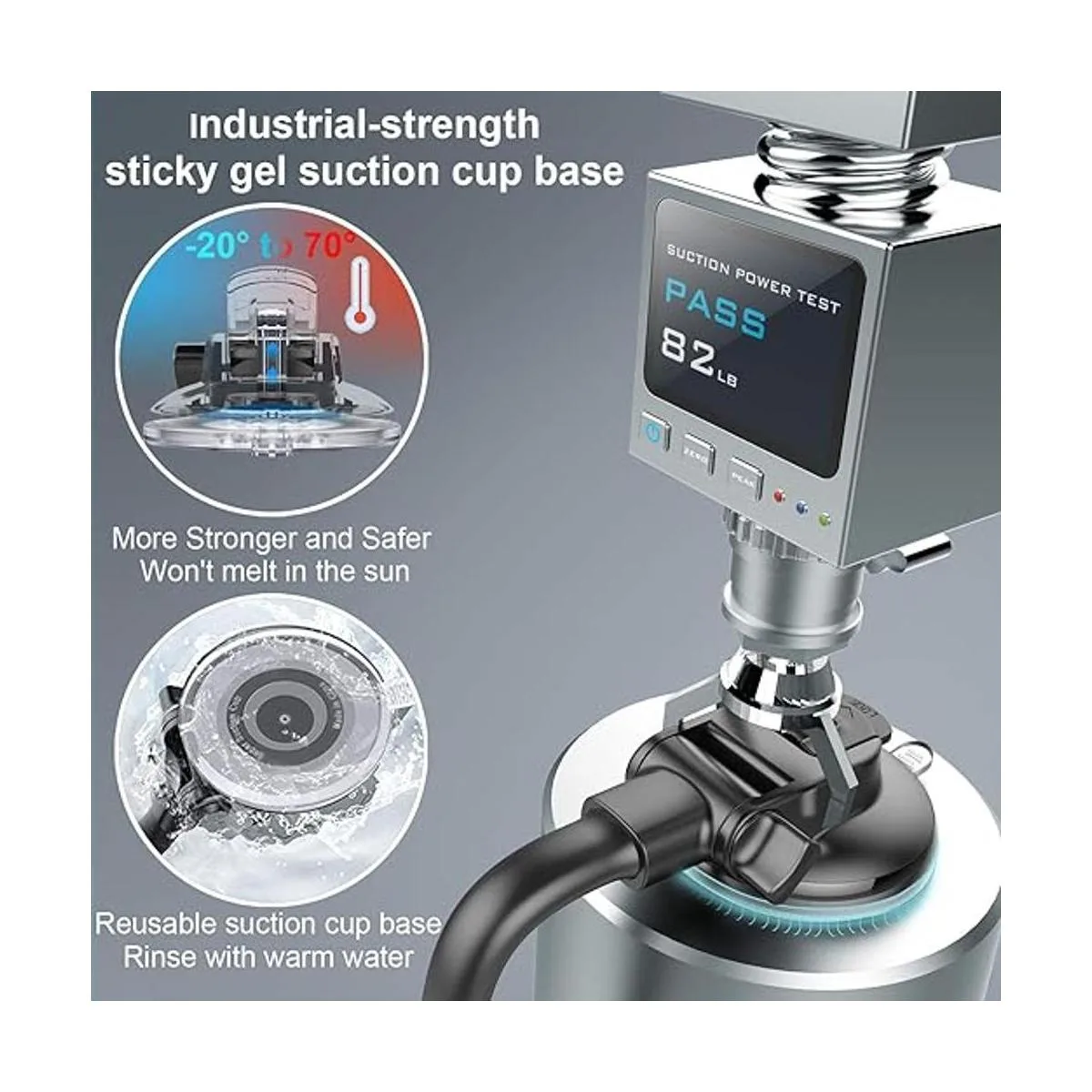 Ventosa fuerte fiable: este soporte de teléfono con ventosa utiliza nuestra tecnología de succión patentada, ventosa con un revestimiento de gel adhesivo para una sujeción más duradera. Esta ventosa no se derrite con el sol.