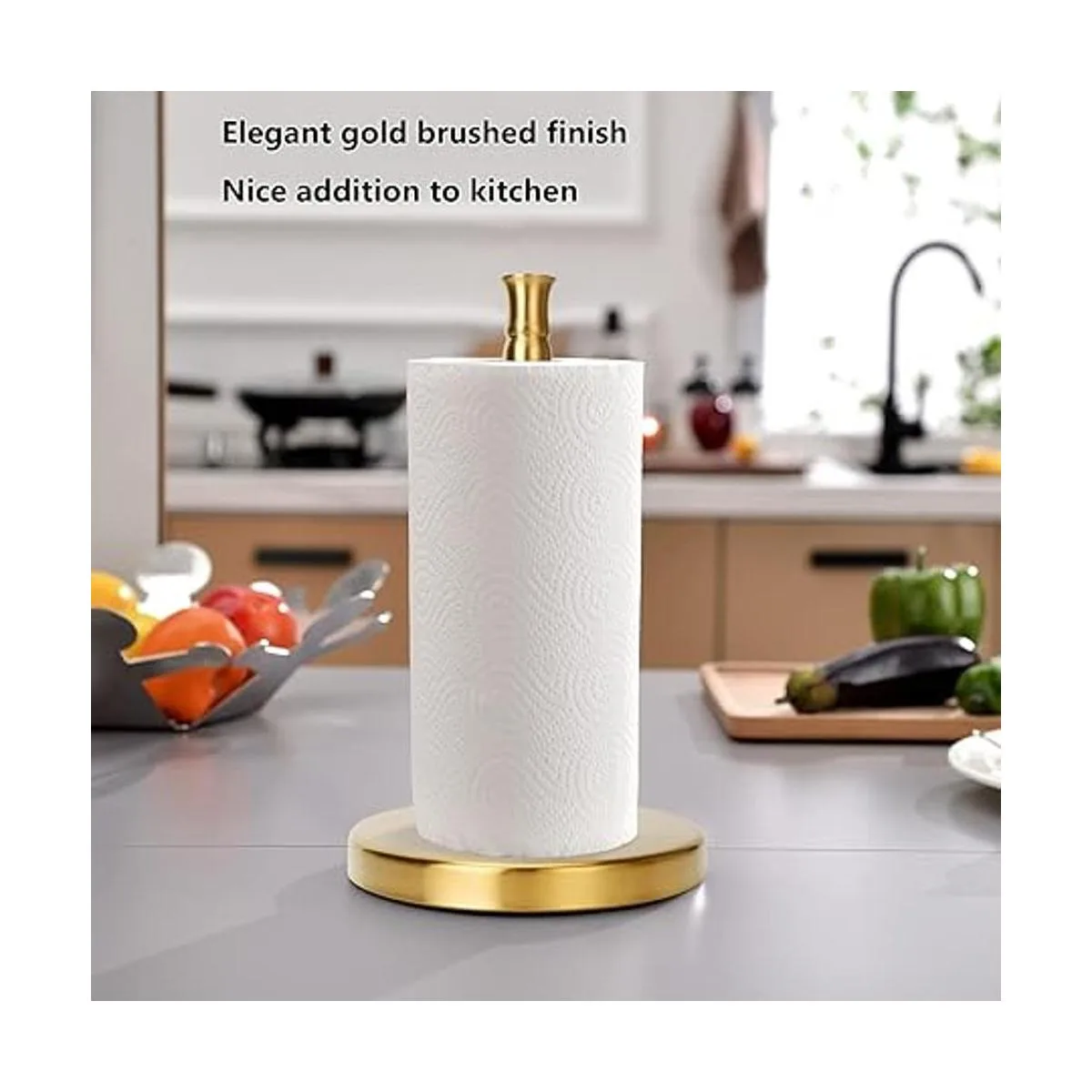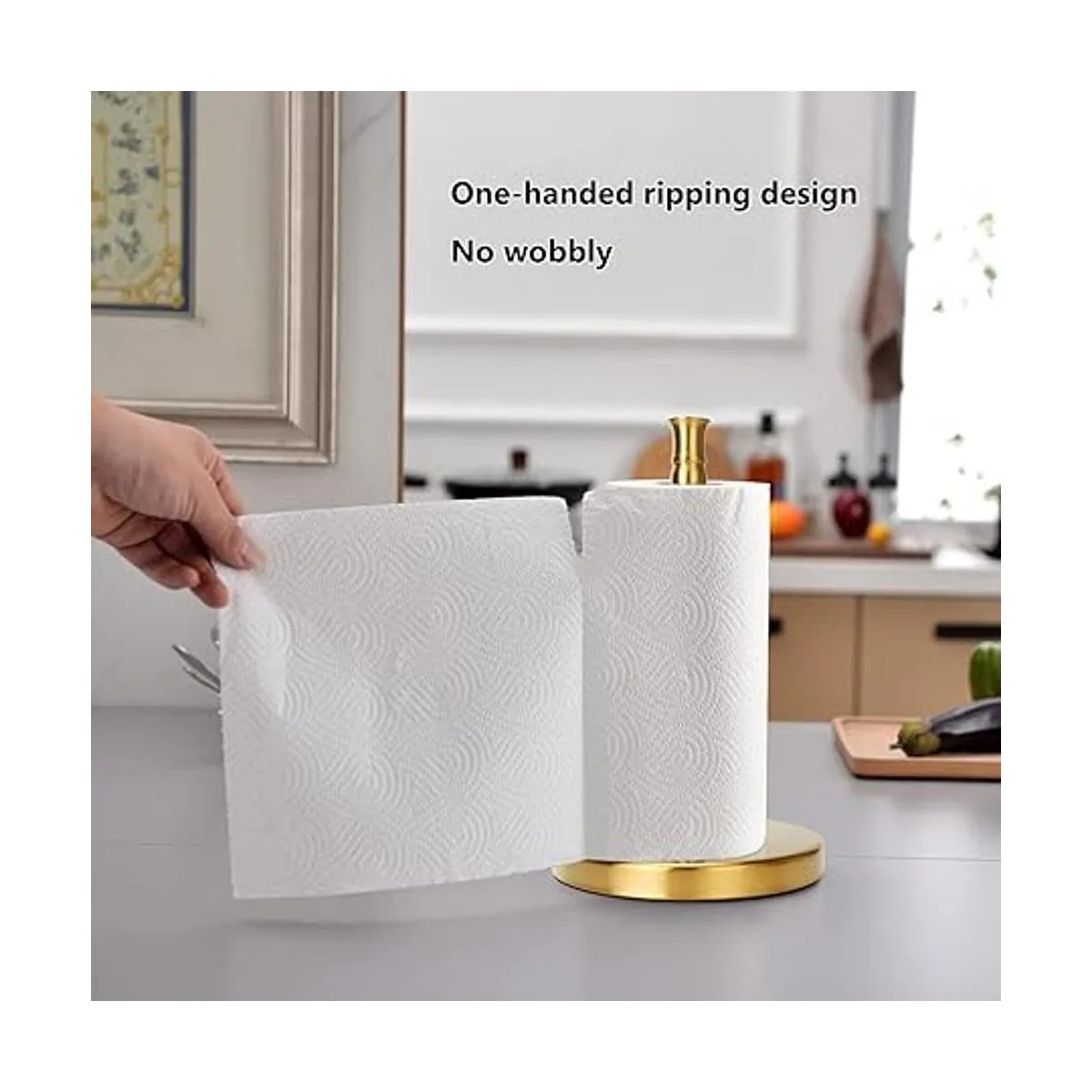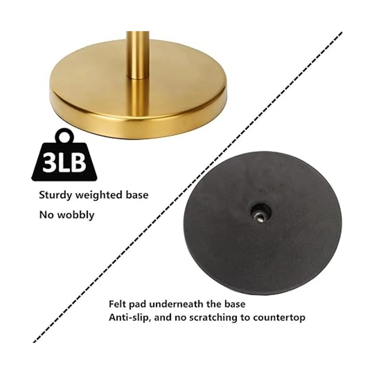Soporte para toallas de papel, base pesada de acero inoxidable 3 libras de peso y 7.5 pulgadas de diámetro, acabado cepillado dorado, encimera de toallero, toalla de papel rasgado con una sola mano, no se tambalea