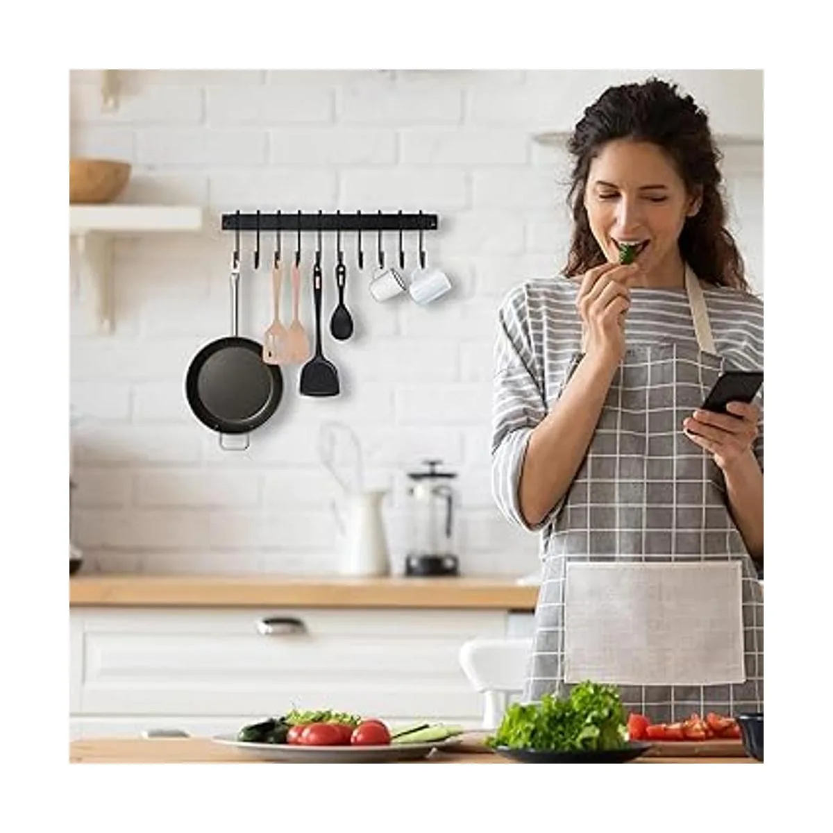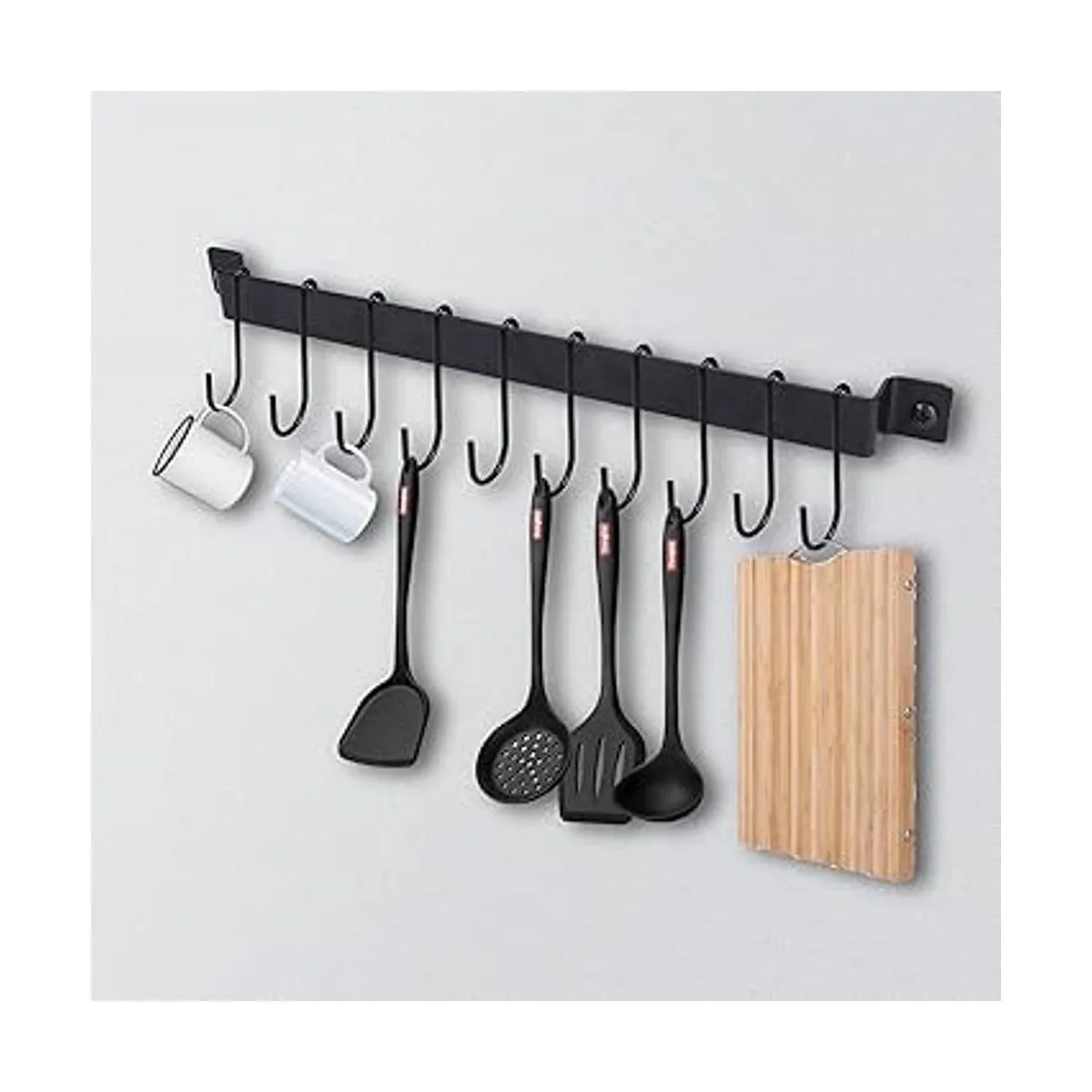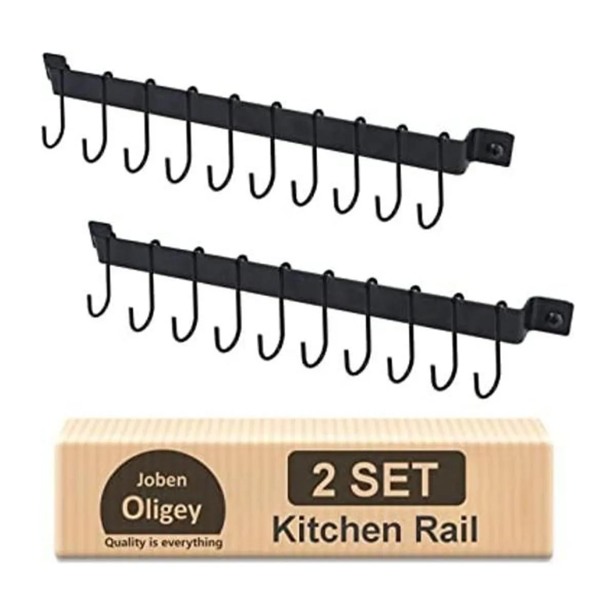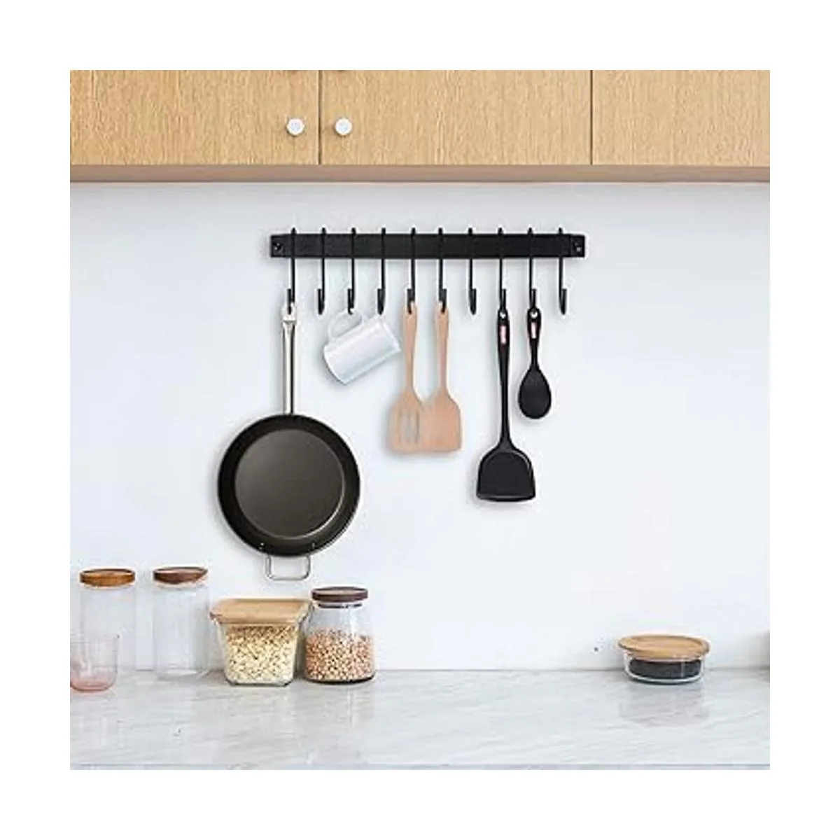 Soporte para utensilios, riel de cocina con 10 ganchos, organizador de ollas de cocina, colgador de hierro forjado para colgar en la pared, soporte de utensilios con negro de 17 pulgadas para tazas de café, tazas, cocina, negro, juego de 2