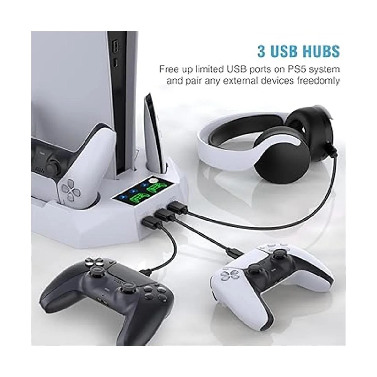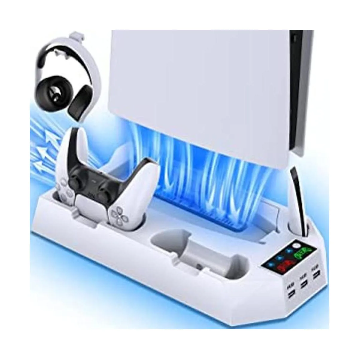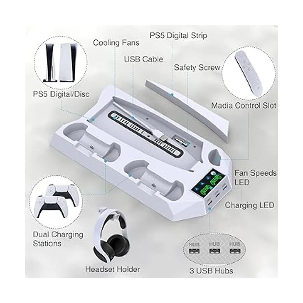 Soporte PS5 y estación de refrigeración con estación de carga de doble controlador para consola Playstation 5, accesorios PS5 incluido cargador de controlador, ventilador de refrigeración, soporte para auriculares, 3 Hub USB, ranura multimedia, tornillo blanco