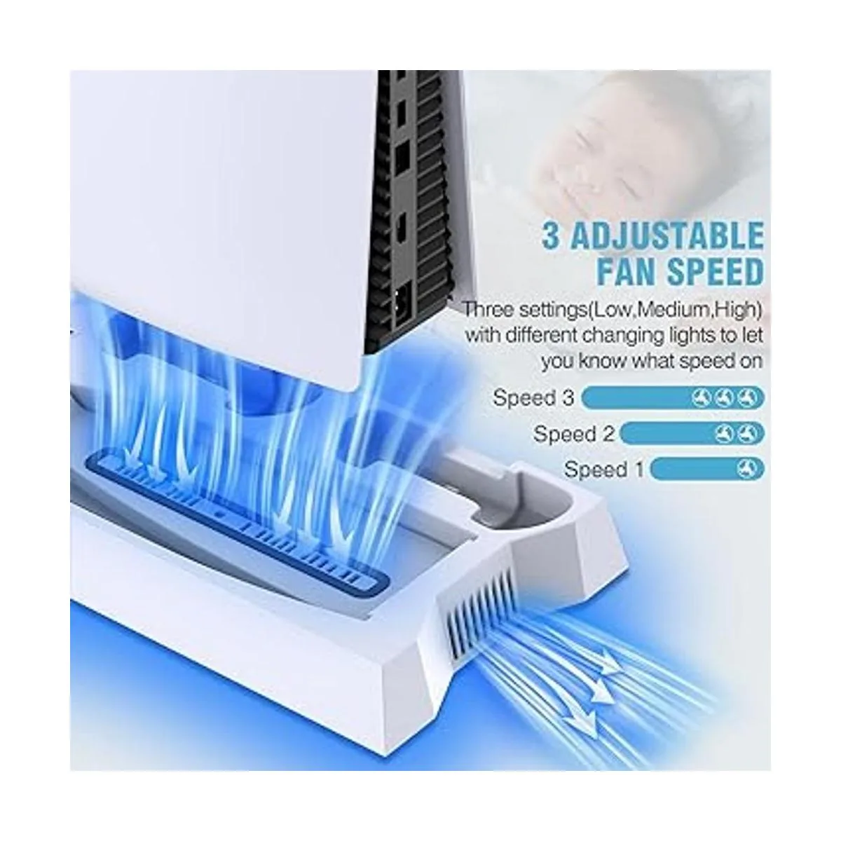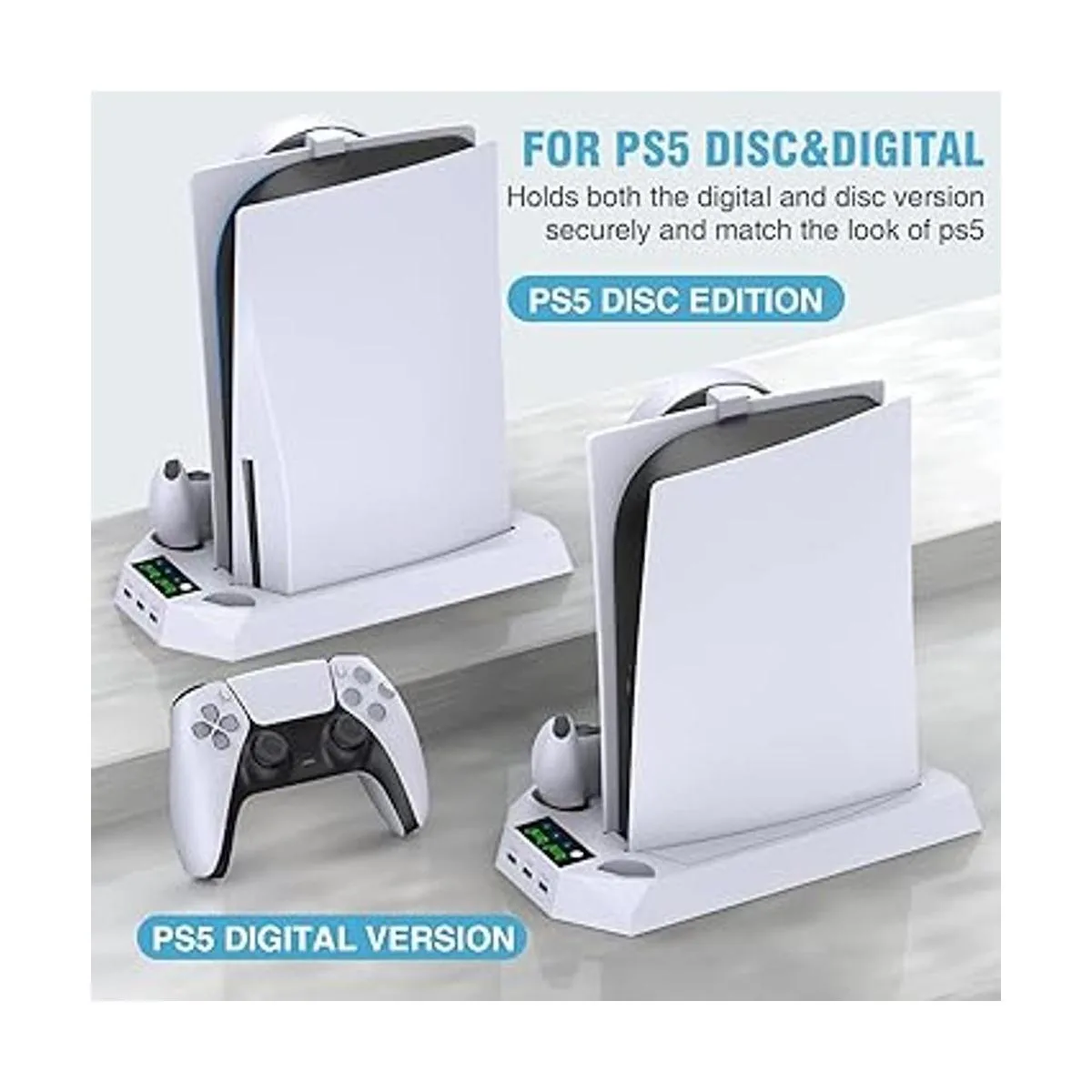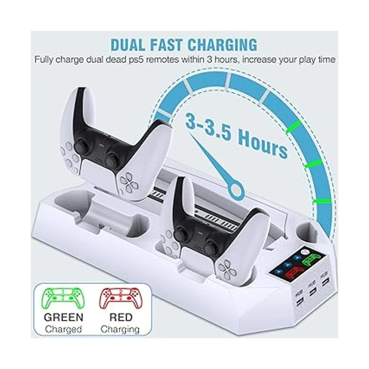 Soporte PS5 y estación de refrigeración con estación de carga de doble controlador para consola Playstation 5, accesorios PS5 incluido cargador de controlador, ventilador de refrigeración, soporte para auriculares, 3 Hub USB, ranura multimedia, tornillo blanco