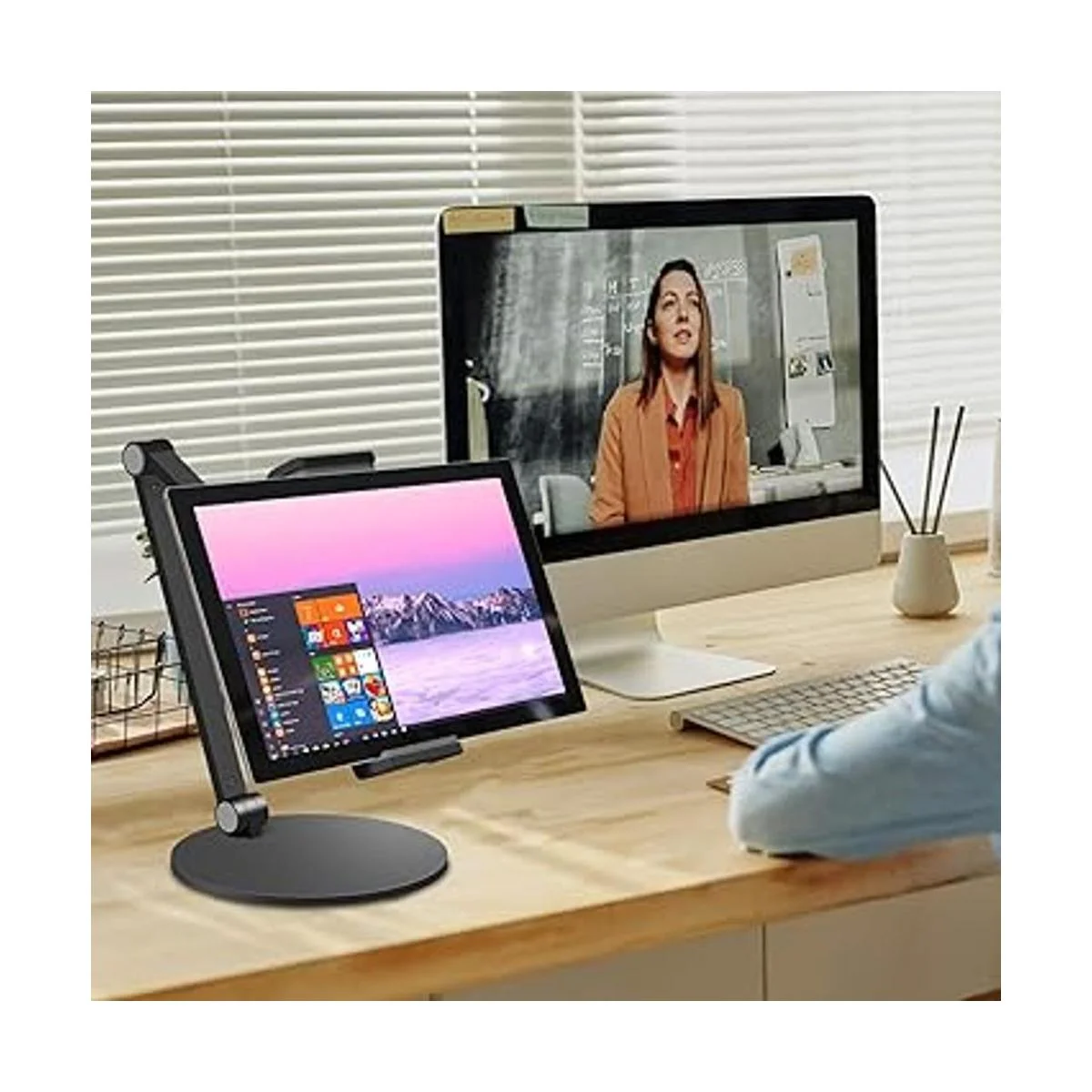 Diseño de ángulo y altura ajustable: soporte giratorio de 360 grados para tablet para satisfacer cualquier ángulo de visión. El diseño ergonómico es cómodo para reuniones de zoom, Facetime, ver o jugar. Te protege del dolor de cuello y hombros.