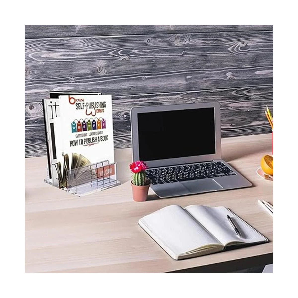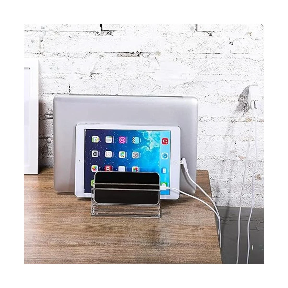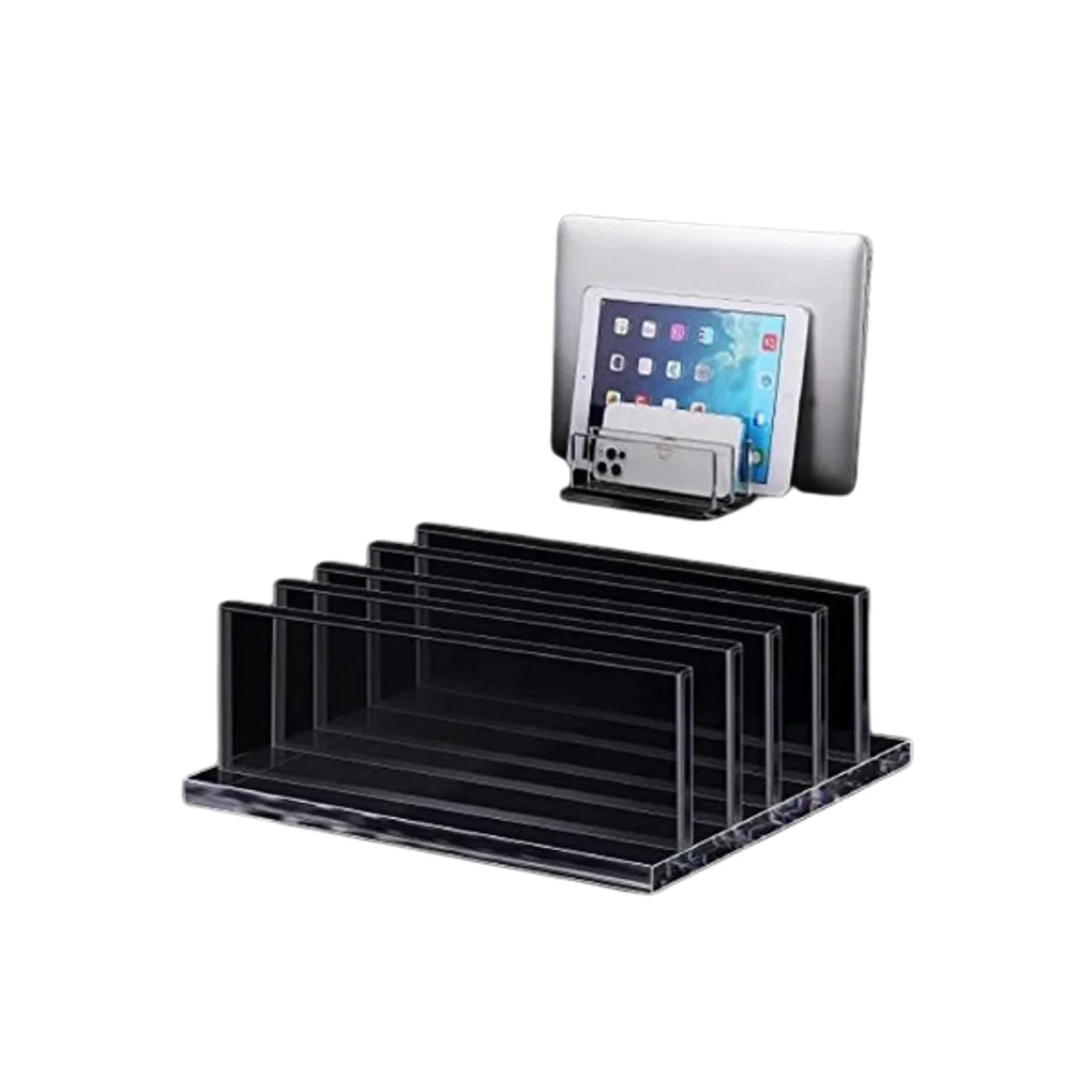 Soporte vertical acrílico transparente de 4 compartimentos, puede acomodar con un grosor de menos de 0.8 in, se adapta a la mayoría de portátiles