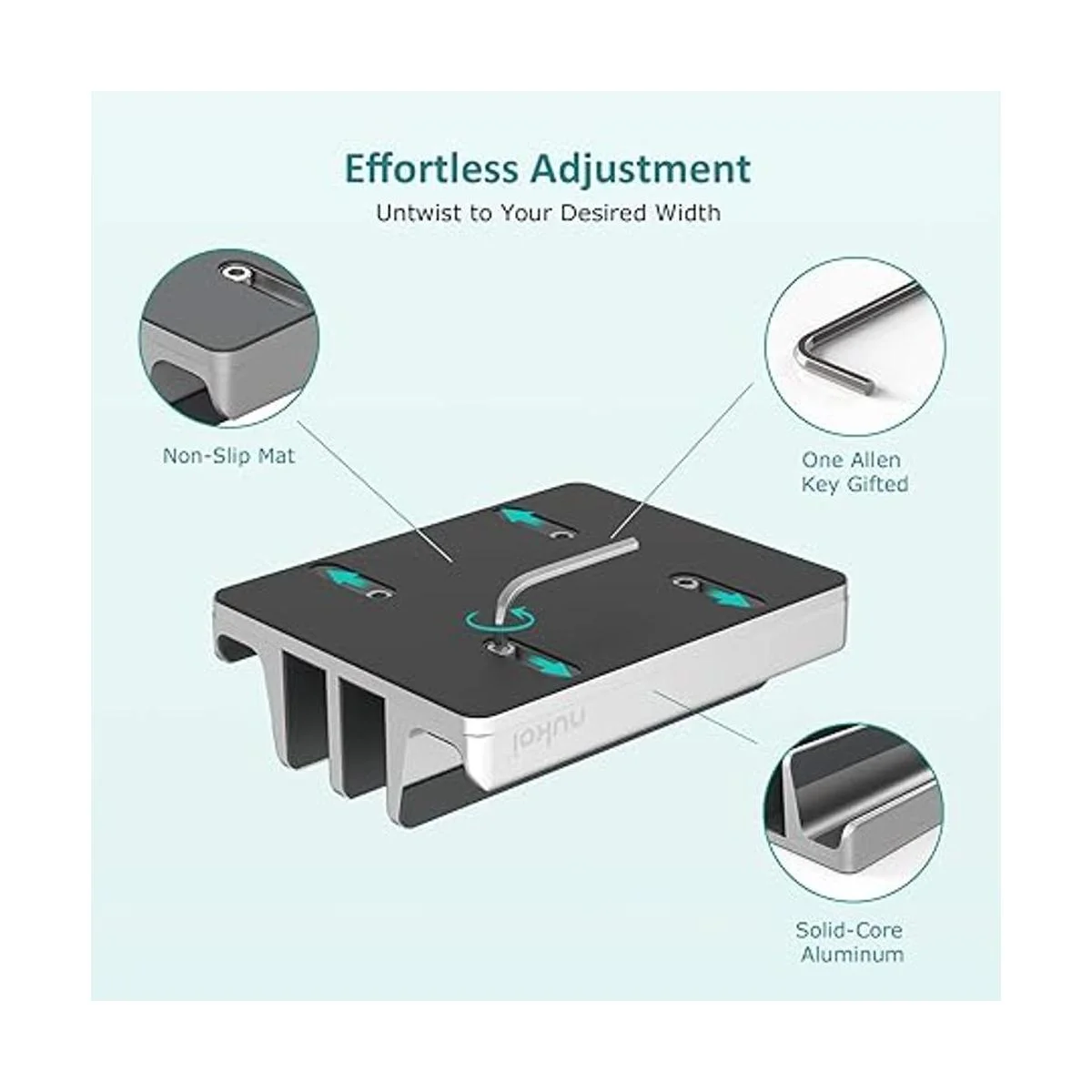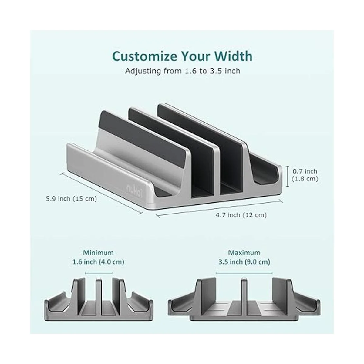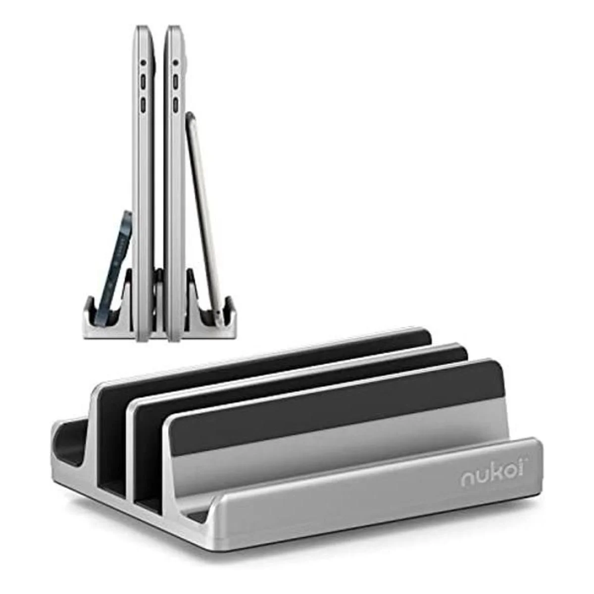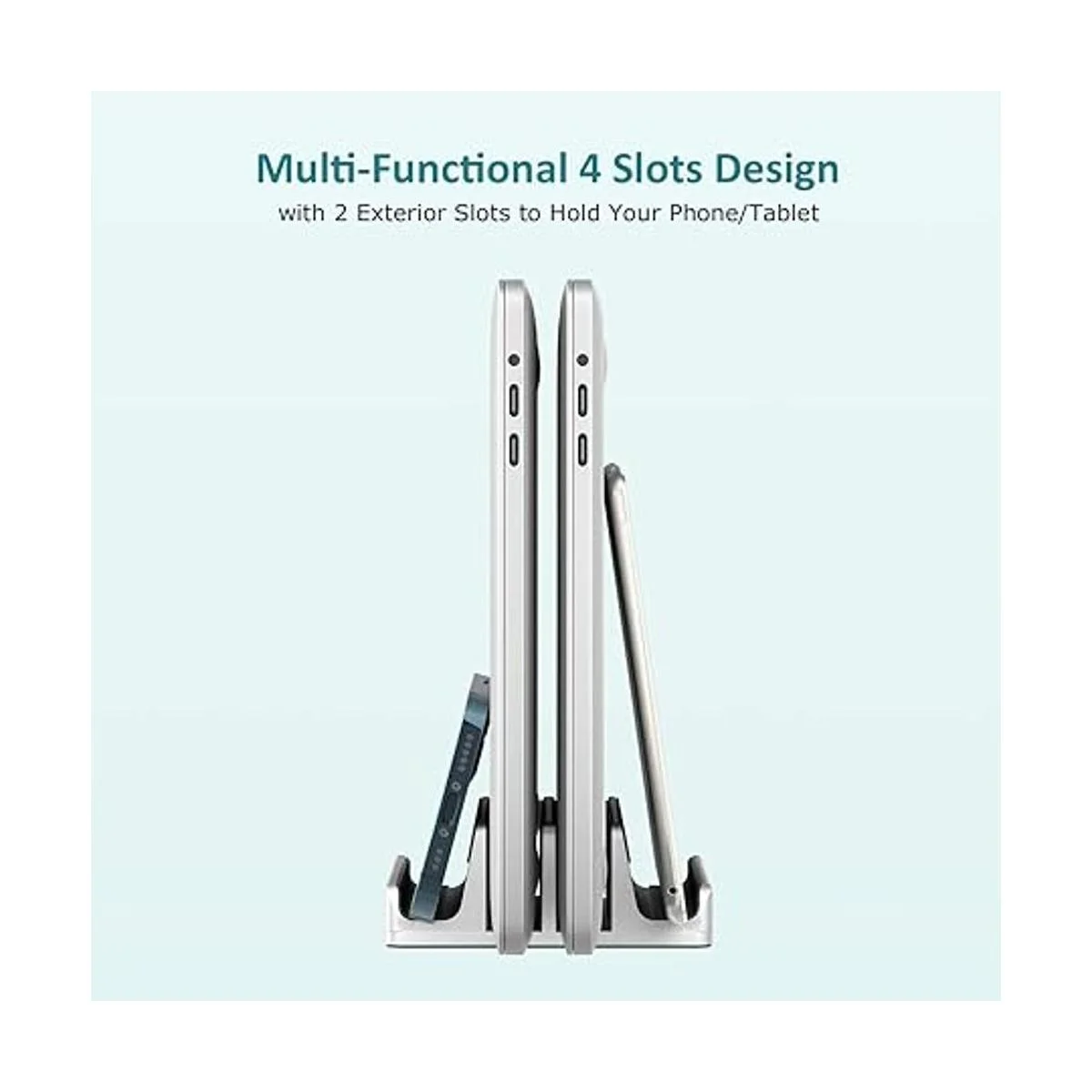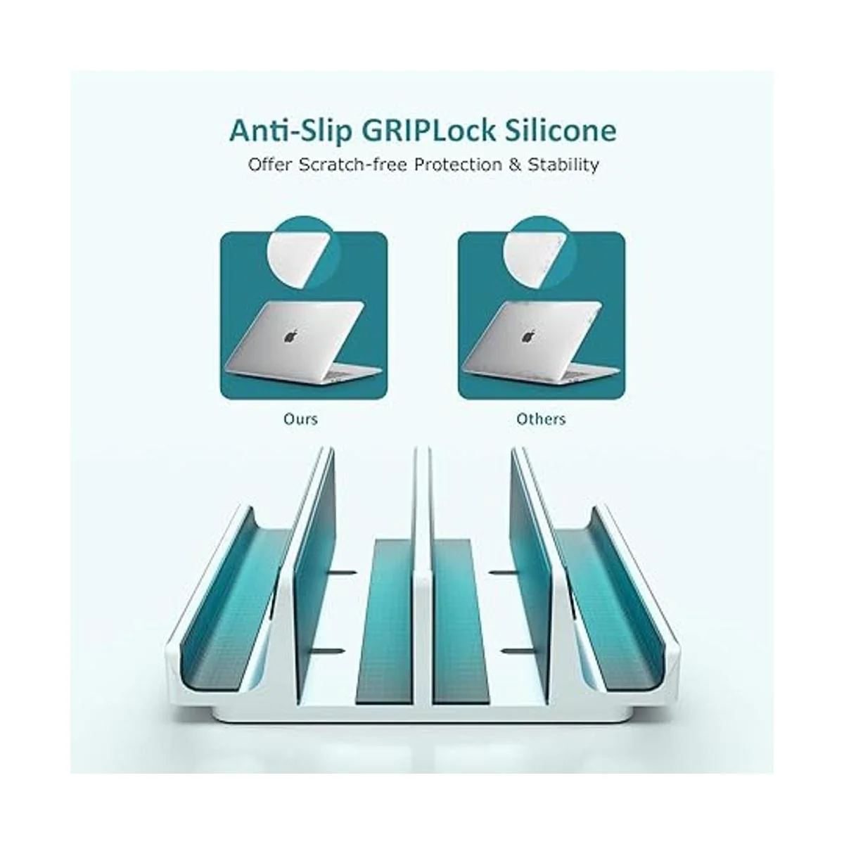 Soporte vertical para portátil SPACEMax ajustable Nukoi GRIPLock AntiPunta Silicona 4 ranuras Soporte de escritorio de aluminio Soporte de doble muelle 2 ranuras para teléfono para portátiles de hasta 17.3, tabletas, teléfonos, color plateado