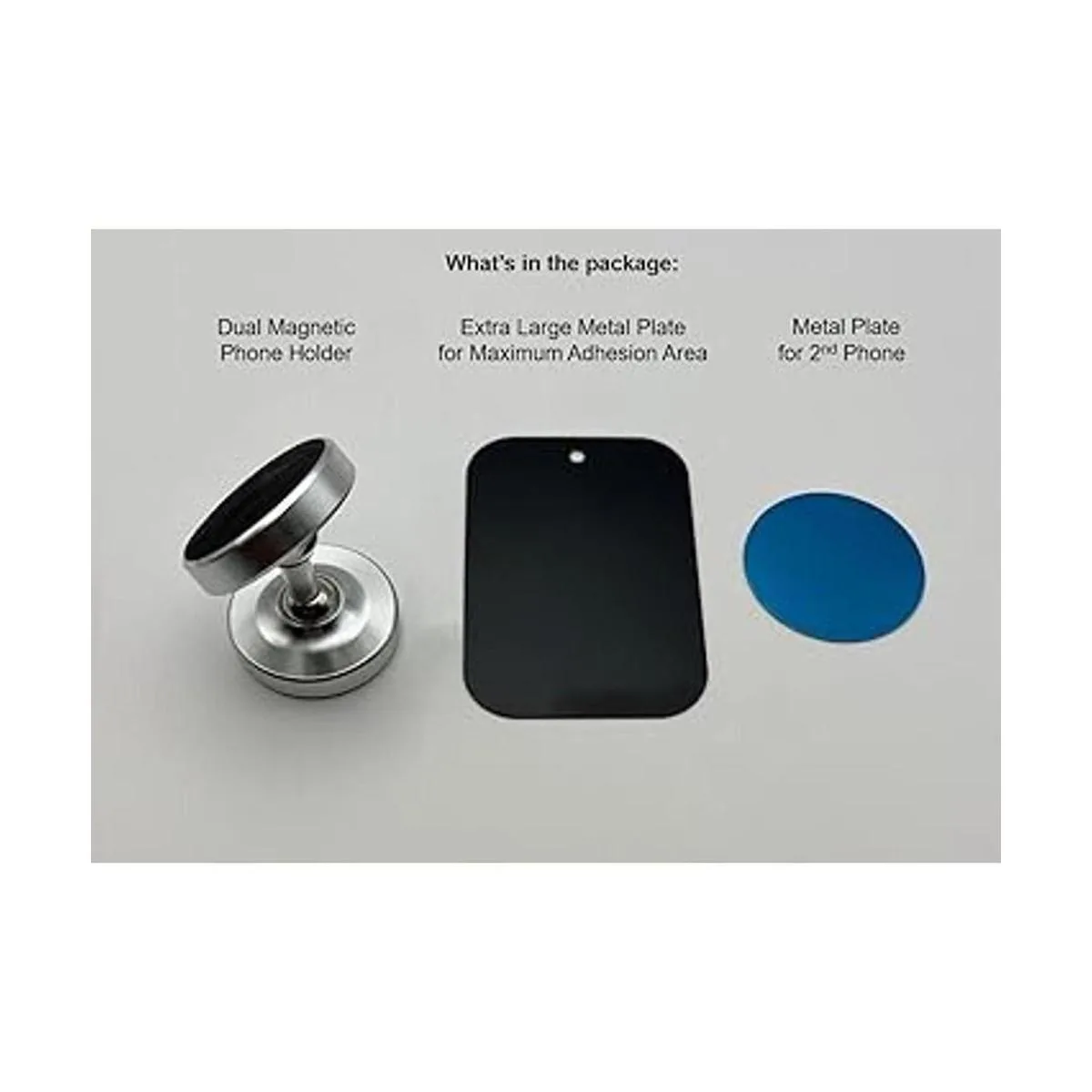 Viene con 2 placas metálicas adhesivas para el teléfono: 1 placa rectangular grande y 1 placa redonda más pequeña.