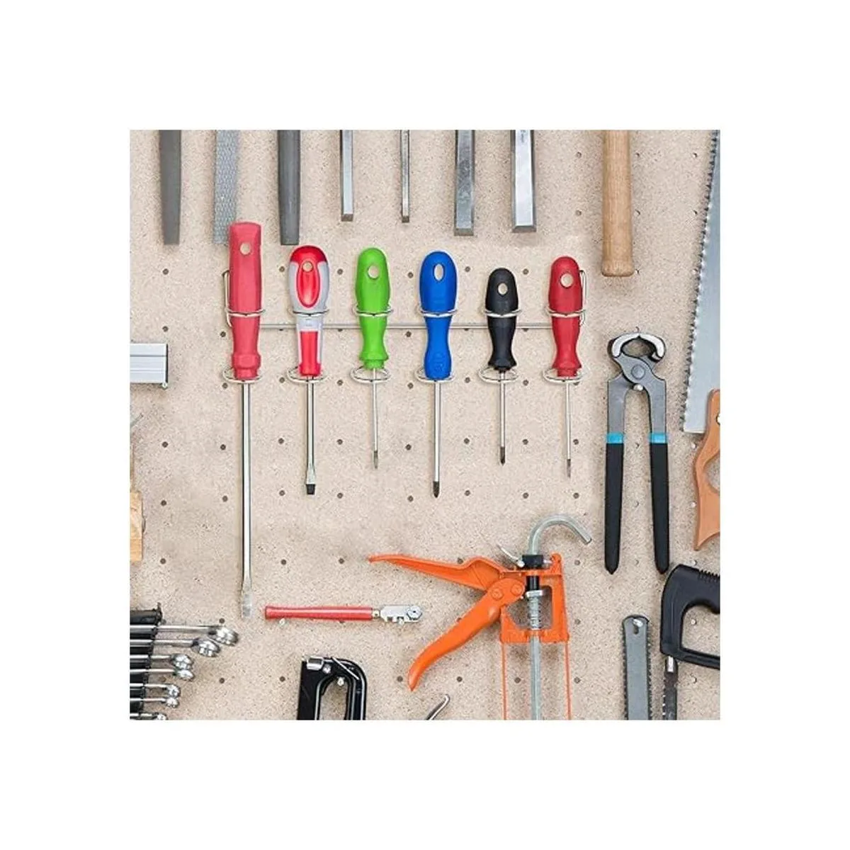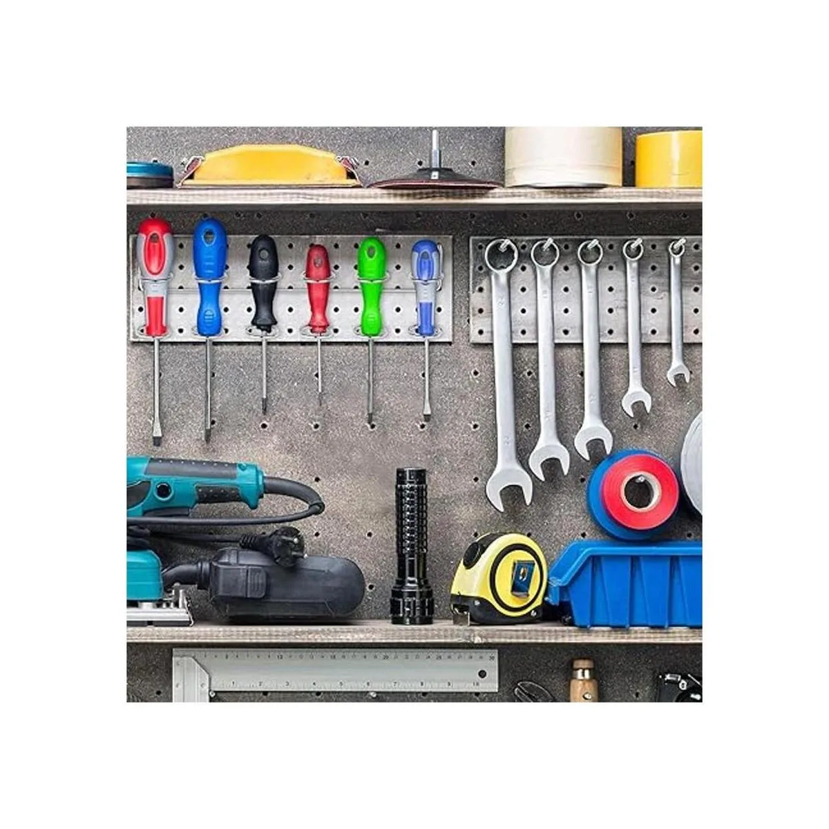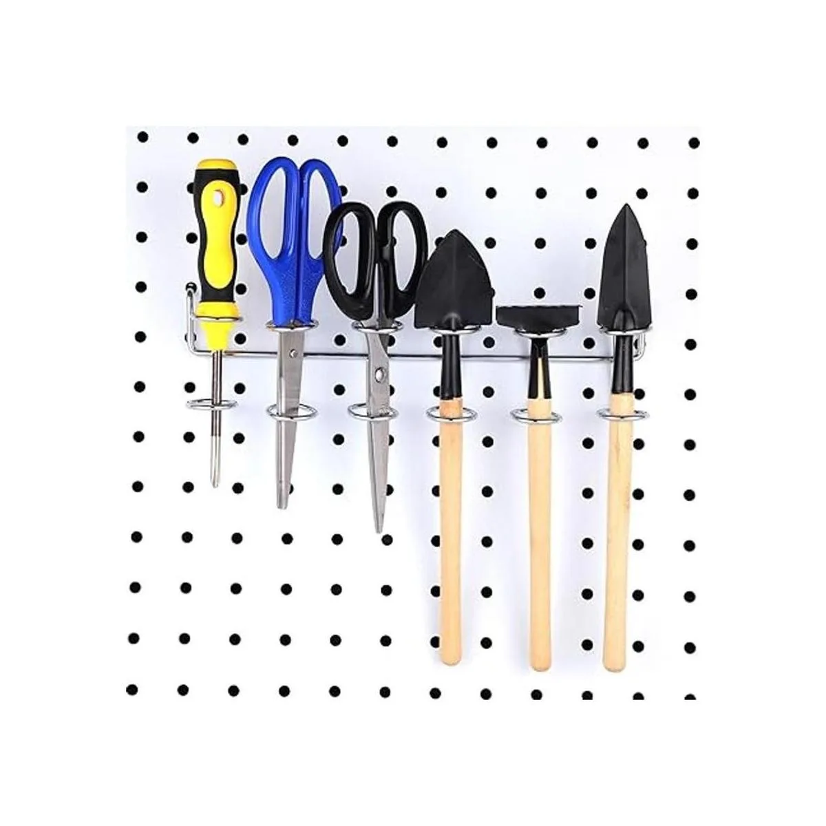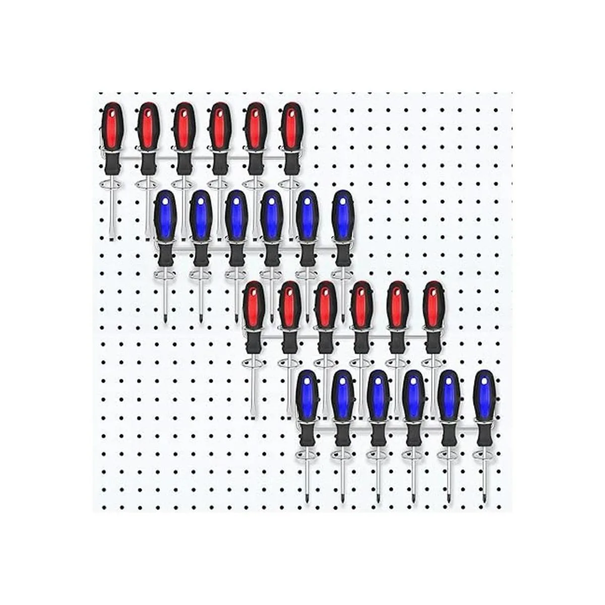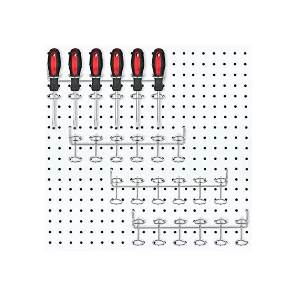 Diseño de estilo anillo: cada gancho de metal para tablero de clavijas tiene 12 ganchos de tablero de clavijas estilo anillo, y cada lado se puede colocar 6 anillos, pueden almacenar destornilladores, alicates y otras necesidades diarias, muy adecuado para colgar artículos ligeros y herramientas comunes, ahorrando tiempo y espacio