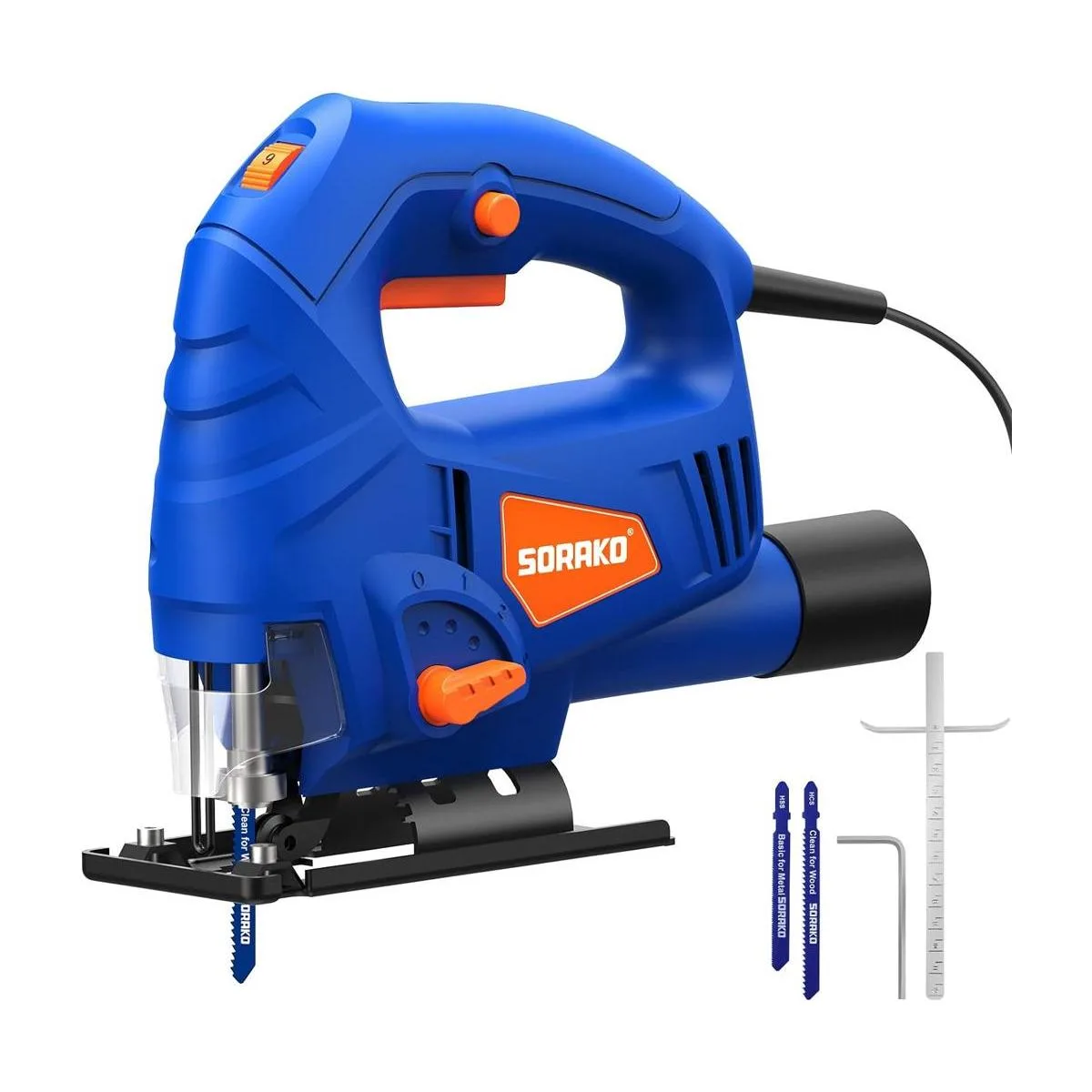 SORAKO Sierra de calar de 5.0 amperios, herramienta de sierra de calar con cable, sierra de calar 8003000 SPM, 6 velocidades variables, corte biselado de 045, 4 juegos orbitales, para carpintería con 2 cuchillas y regla de escala
