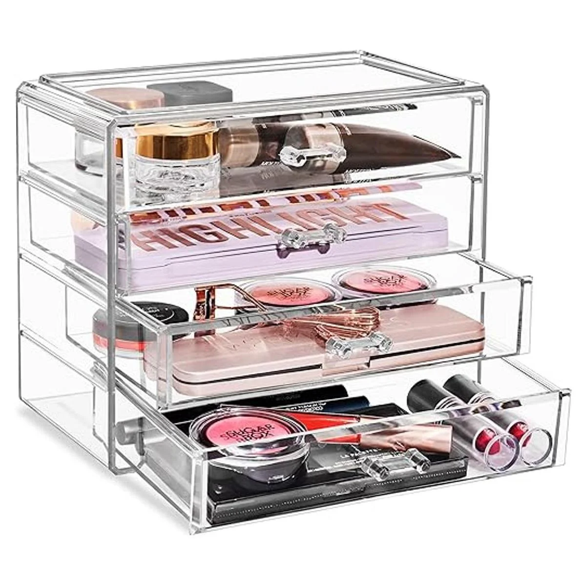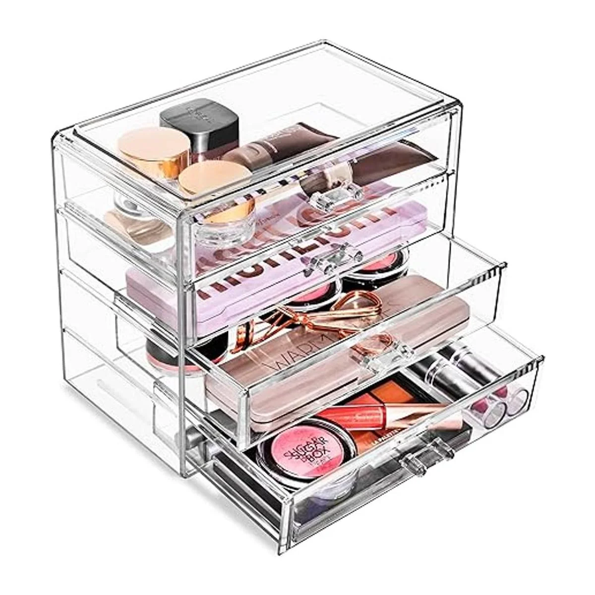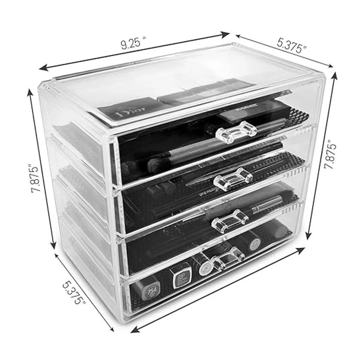Sorbus Estuche de almacenamiento de cosméticos acrílicos para maquillaje y joyería, 4 cajones grandes de espacio, elegante funda de baño acrílica ideal para lápiz labial, esmalte de uñas, pinceles, joyas y más transparente
