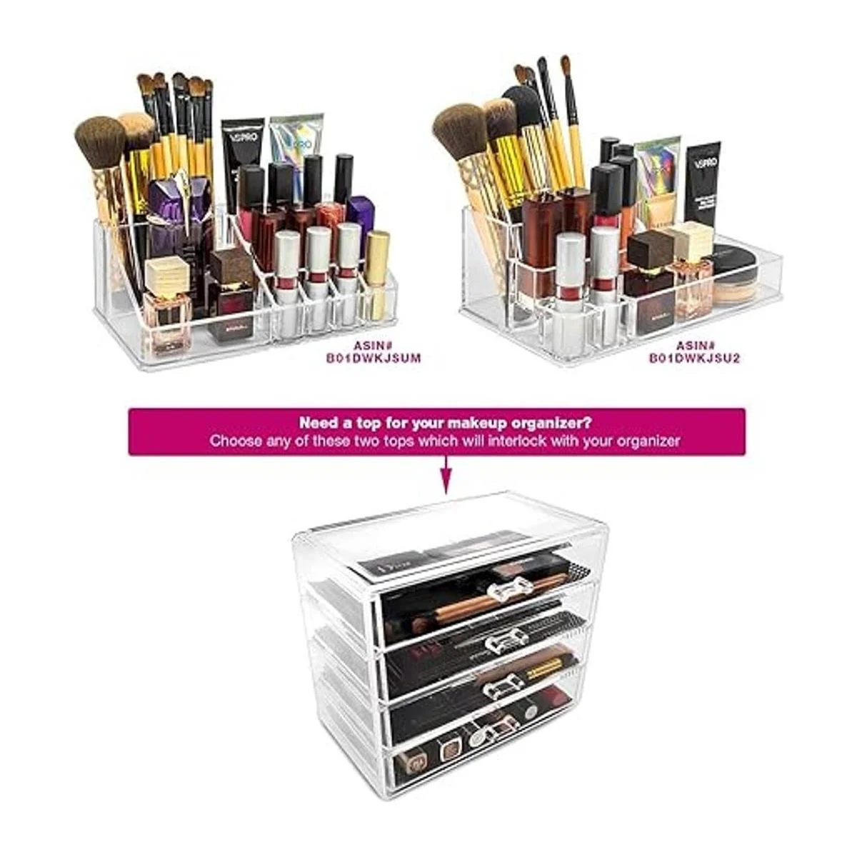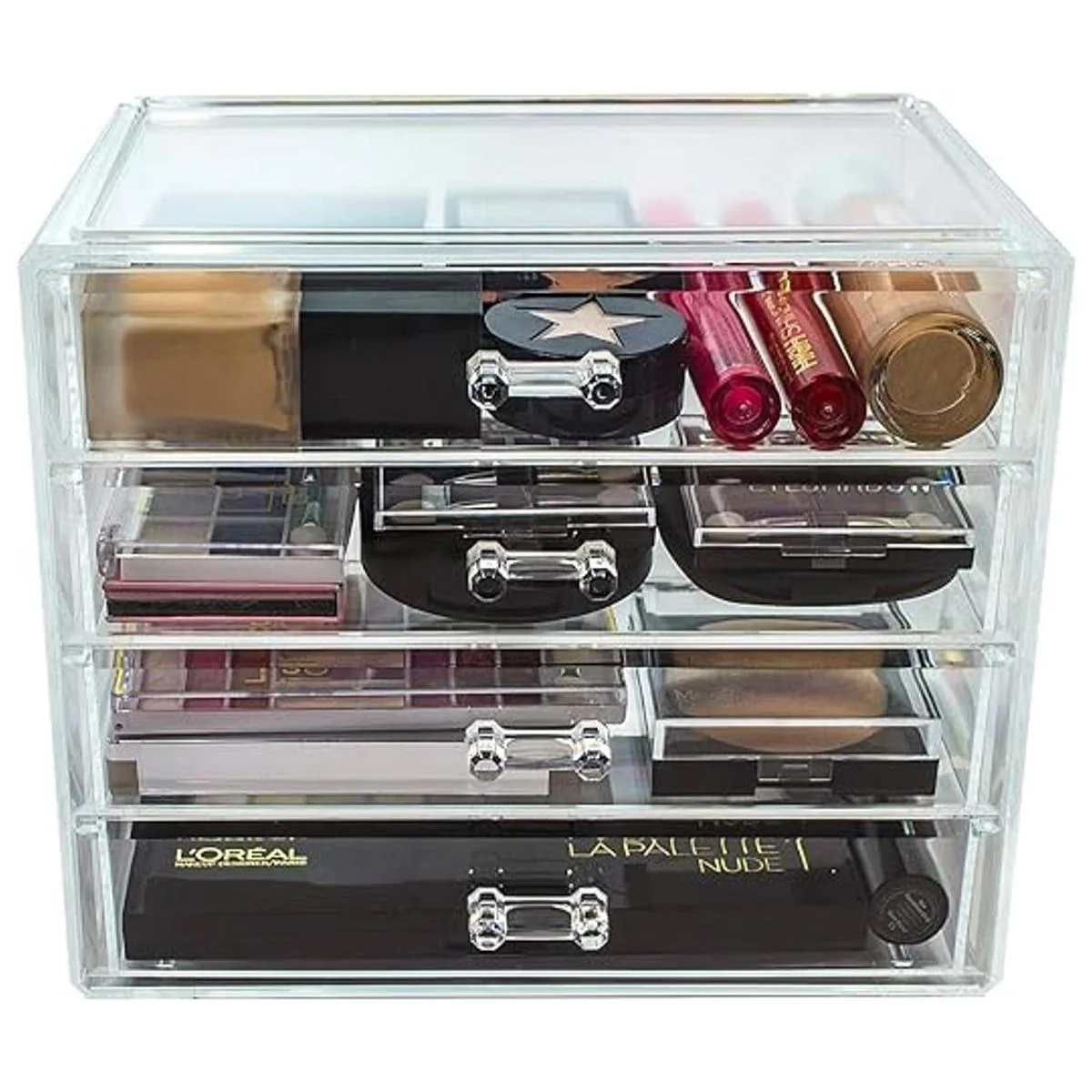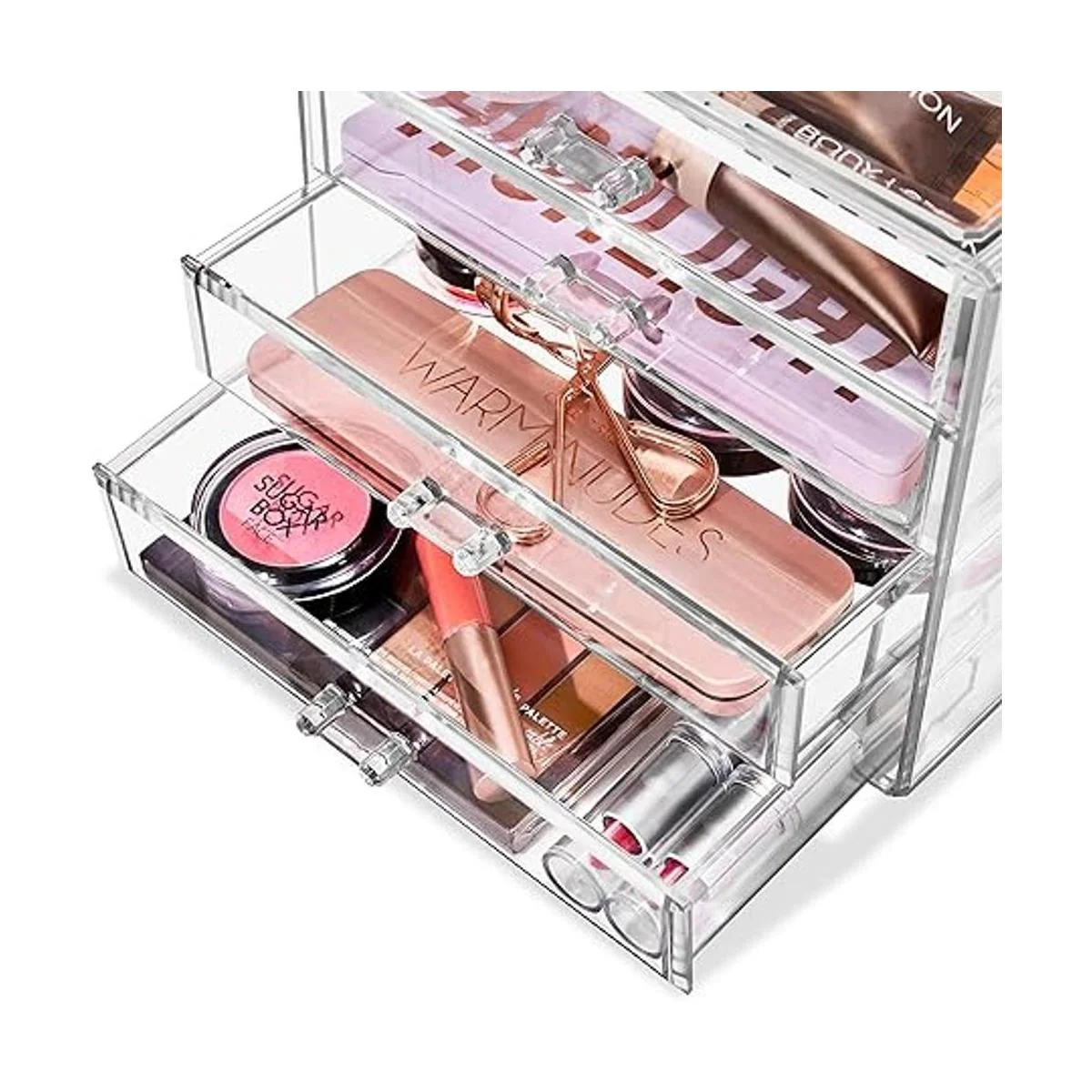 Sorbus Estuche de almacenamiento de cosméticos acrílicos para maquillaje y joyería, 4 cajones grandes de espacio, elegante funda de baño acrílica ideal para lápiz labial, esmalte de uñas, pinceles, joyas y más transparente