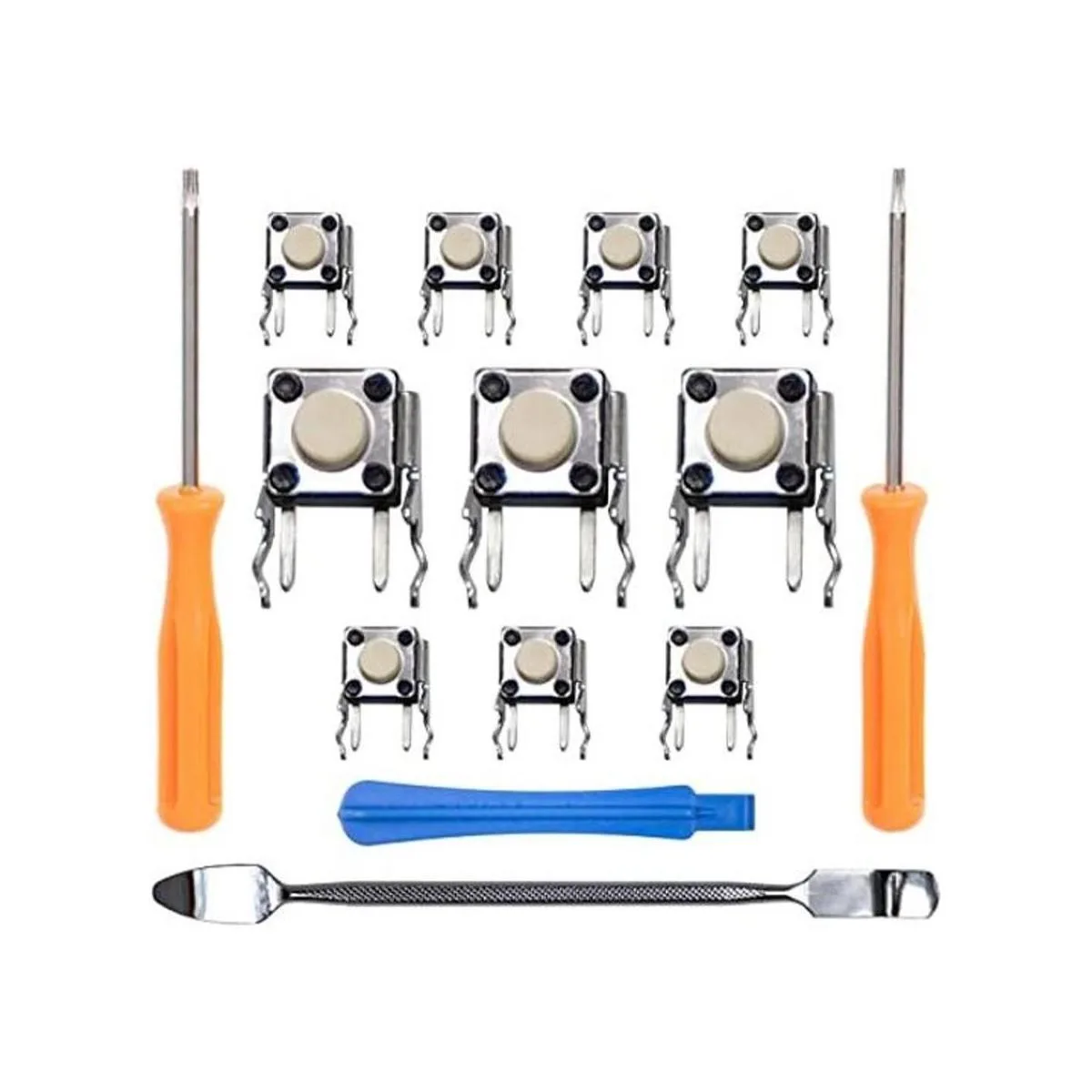 El paquete incluye: 10 interruptores táctiles, 1 destornillador Torx de seguridad T8, 1 destornillador Torx T6, 1 herramienta de palanca. Compatible con cualquier controlador original de Xbox, incluyendo modelos Base, S, X, Elite Series 1 y Elite Series 2.