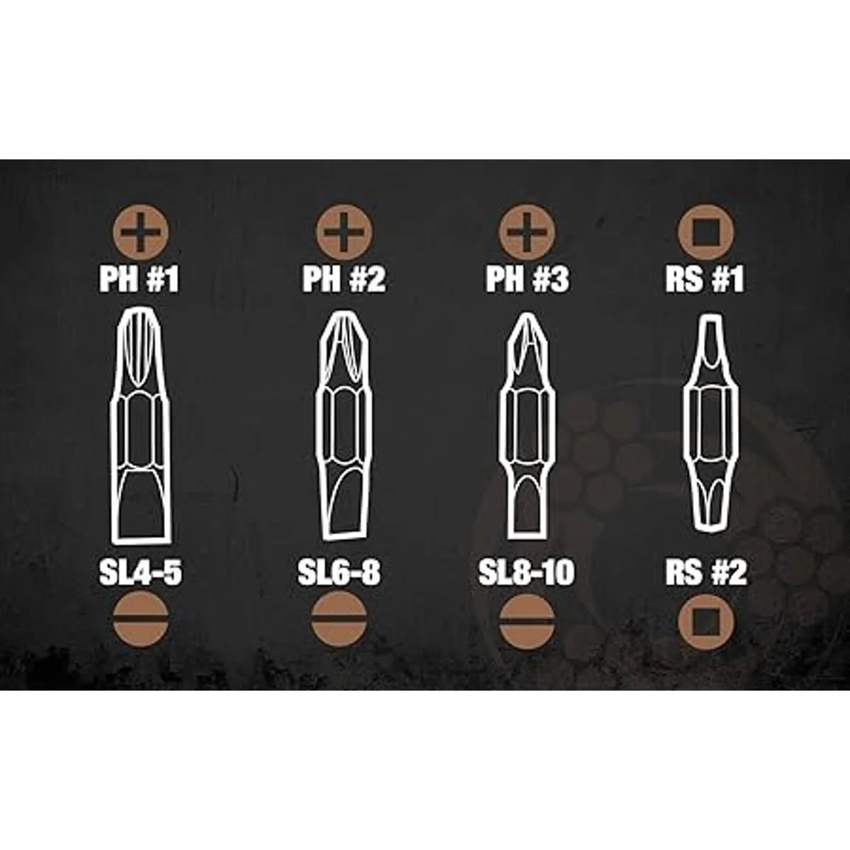 Contiene: 3/16, , 5/16 ranurado; 1, 2, 3 Phillips; 1, 2, cuadrado empotrado; y , 5/16, 3/8, destornillador hexagonal