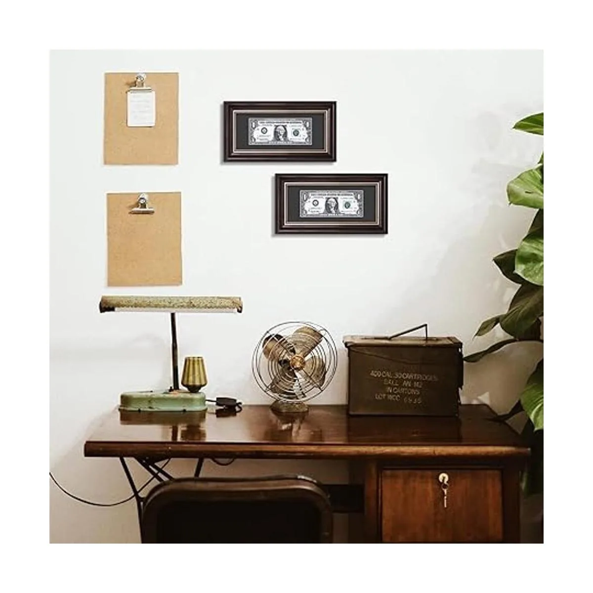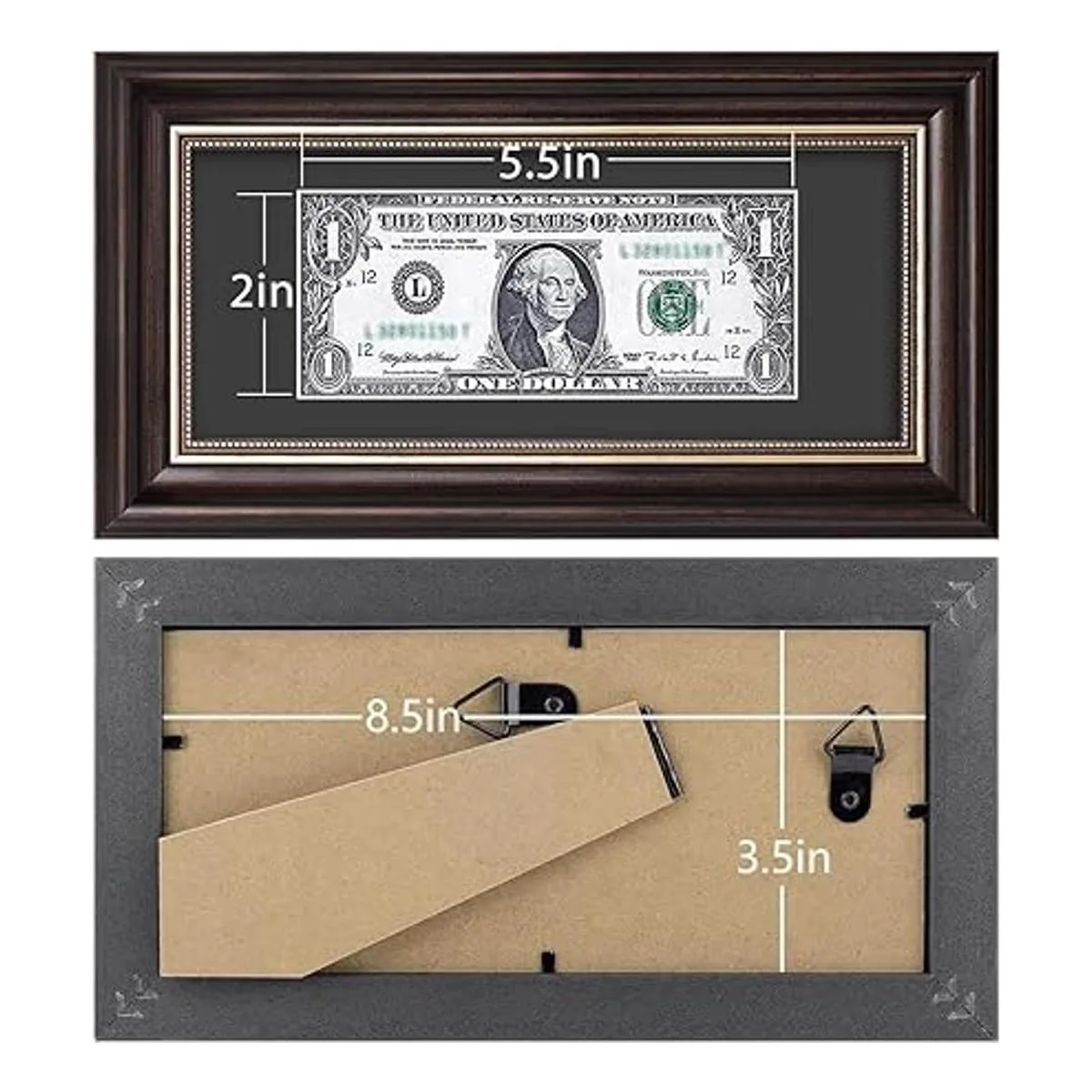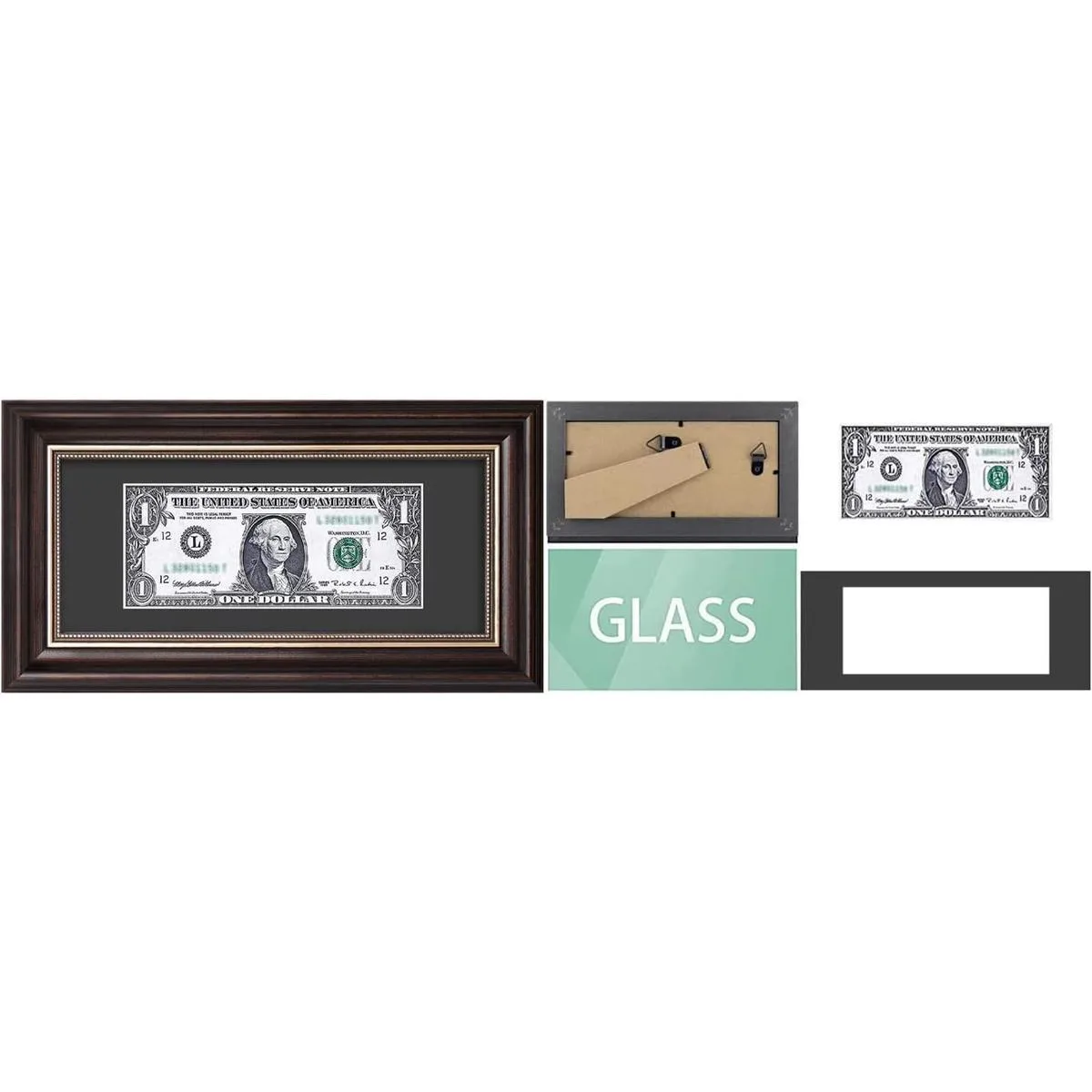 Space Art Deco, Marco de soporte para billetes de dólar marrón oscuro con alfombrilla negra, vidrio templado, soporte de caballetemontaje en pared, ganchos de dientes de sierra marrón oscuroalfombrilla negra
