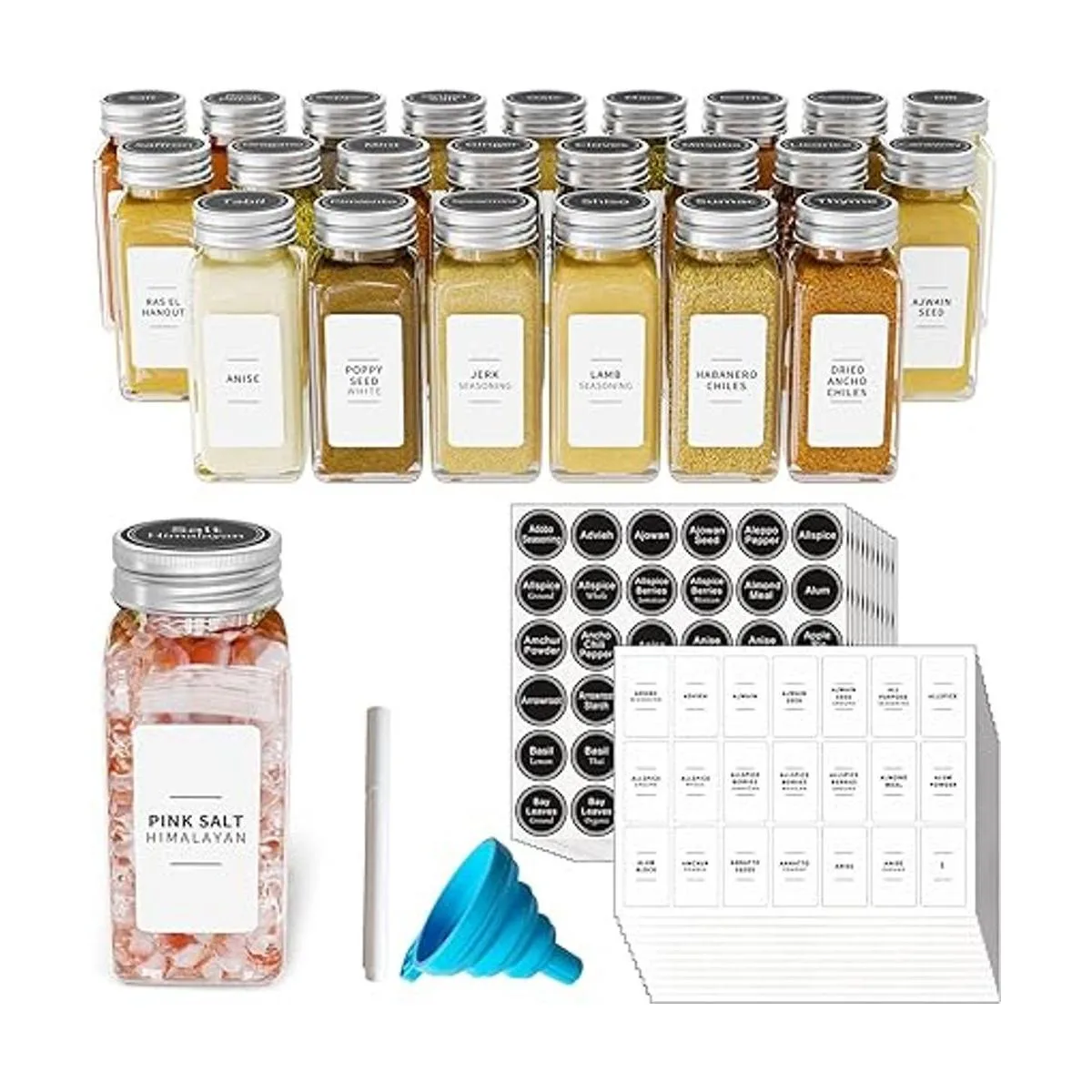 Juego de tarros de especias todo en uno: 24 tarros de especias de vidrio con tapas de coctelera y tapas de metal, 374 etiquetas cuadradas blancas estilo minimalista de granja, 386 etiquetas redondas negras, 1 embudo plegable y 1 bolígrafo blanco; todos los accesorios esenciales incluidos