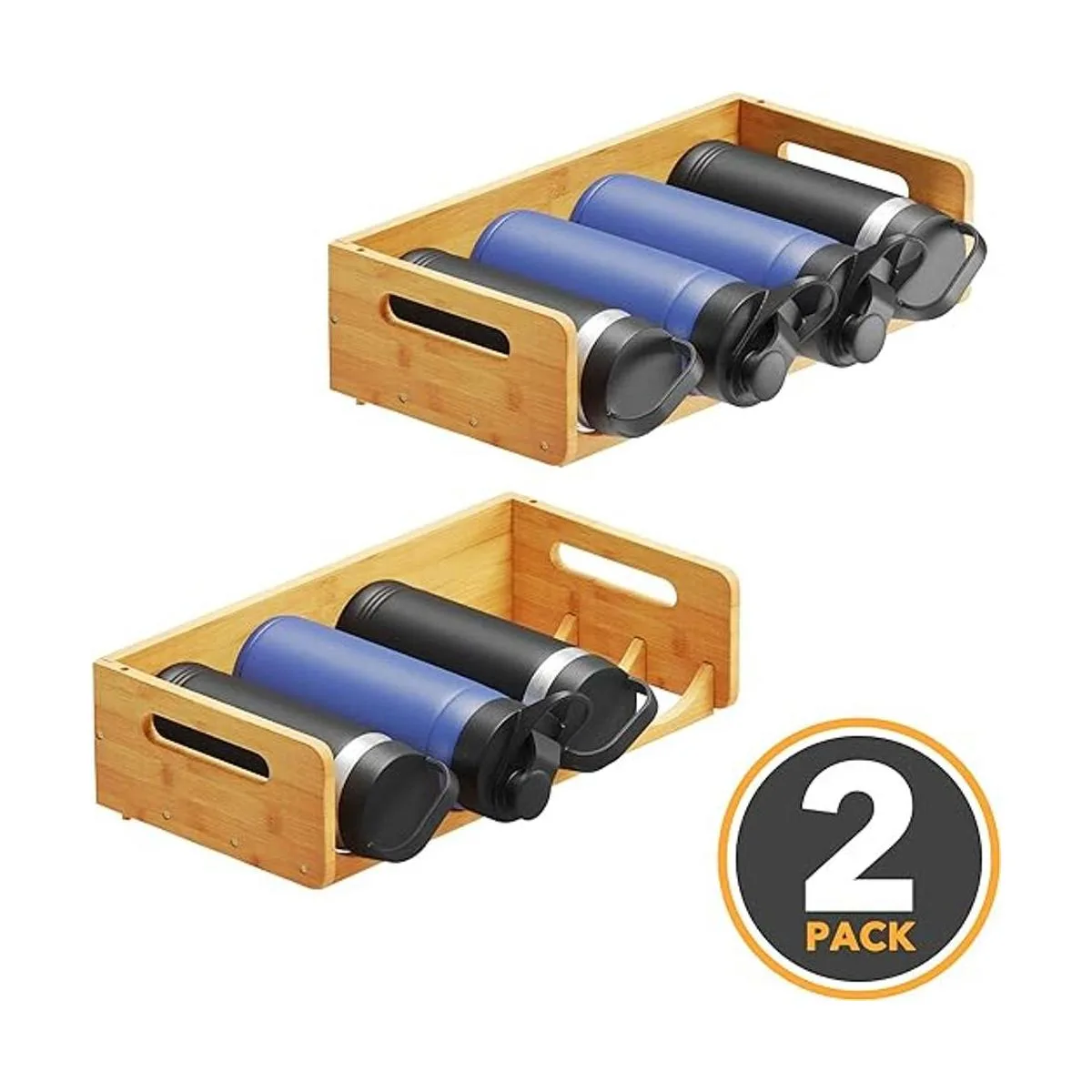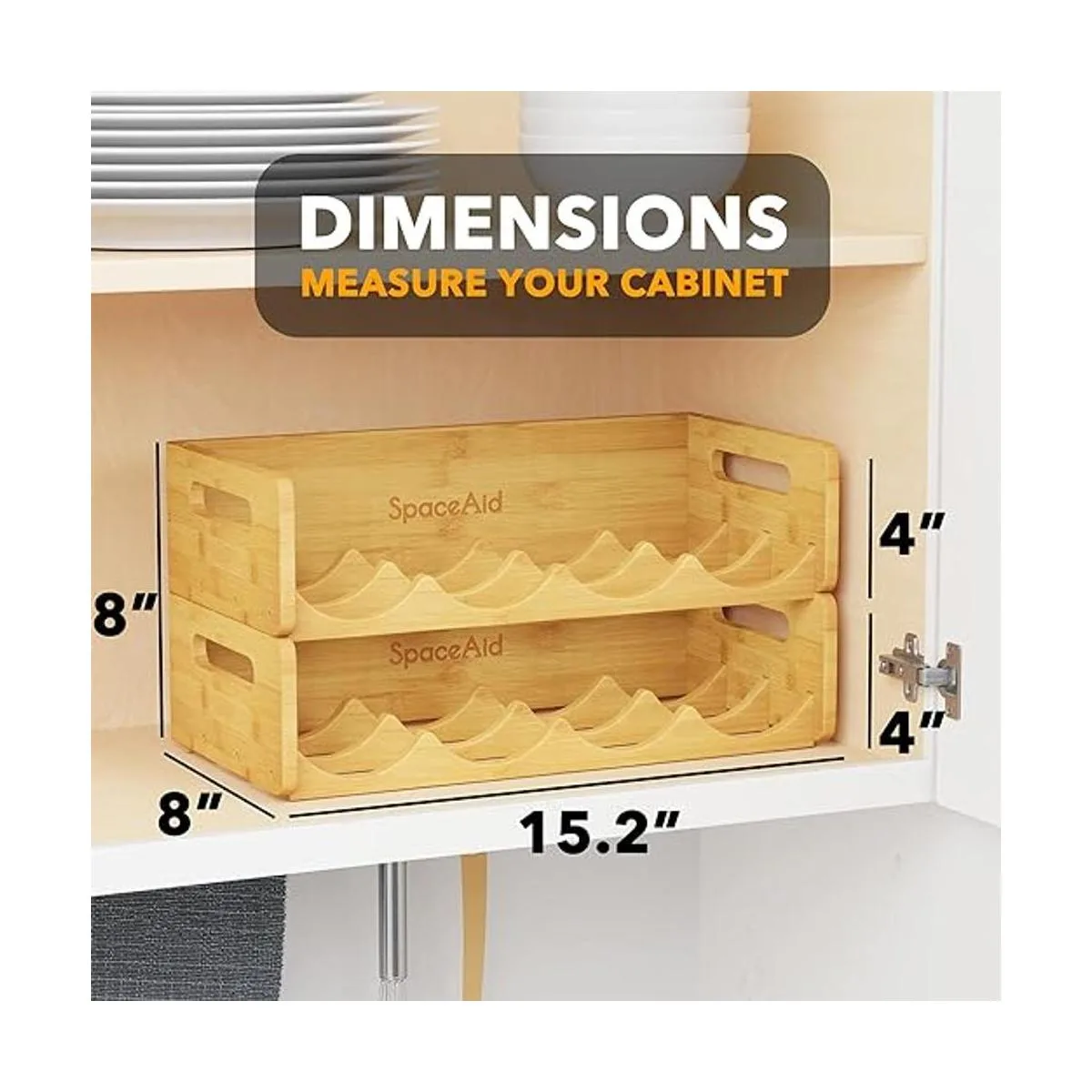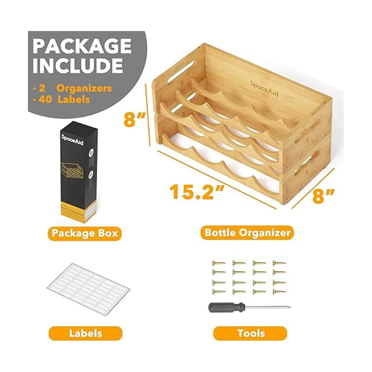 Organizado y hermoso: haz que tu armario de cocina esté limpio y organizado con el organizador de botellas de agua de bambú. El soporte está diseñado para tu organización de diferentes botellas; cada contenedor mide 15.2 pulgadas de ancho x 8 pulgadas de profundidad x 4 pulgadas de alto; este juego tiene capacidad para hasta 8 botellas