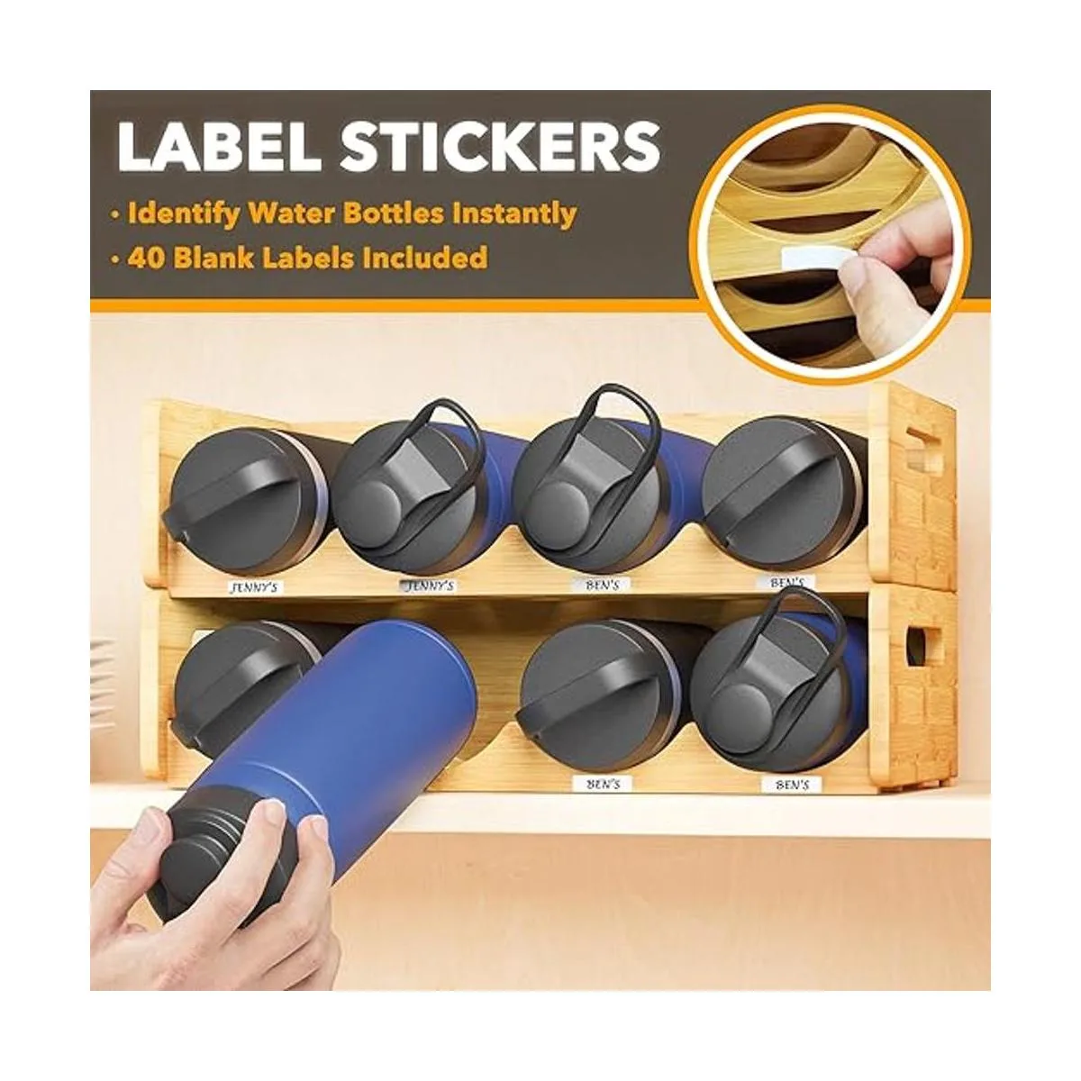 Etiquetas en blanco incluidas: identifica las botellas al instante con las etiquetas en la parte delantera del estante; puedes escribir y etiquetar el soporte de bambú claramente, o no utilizar las etiquetas para mantener el aspecto limpio del organizador de botellas de agua