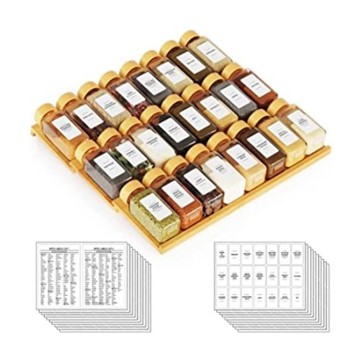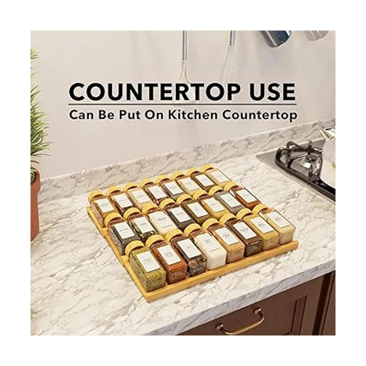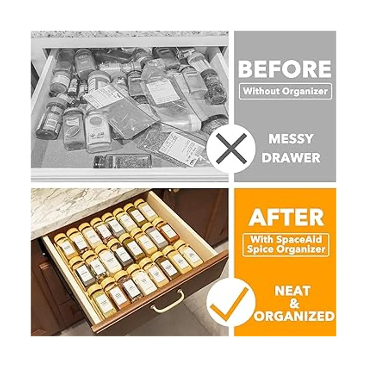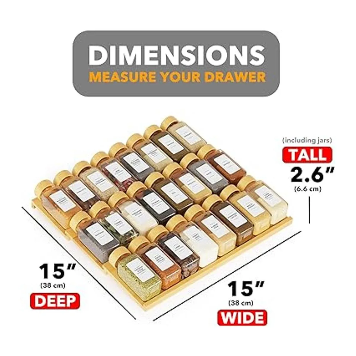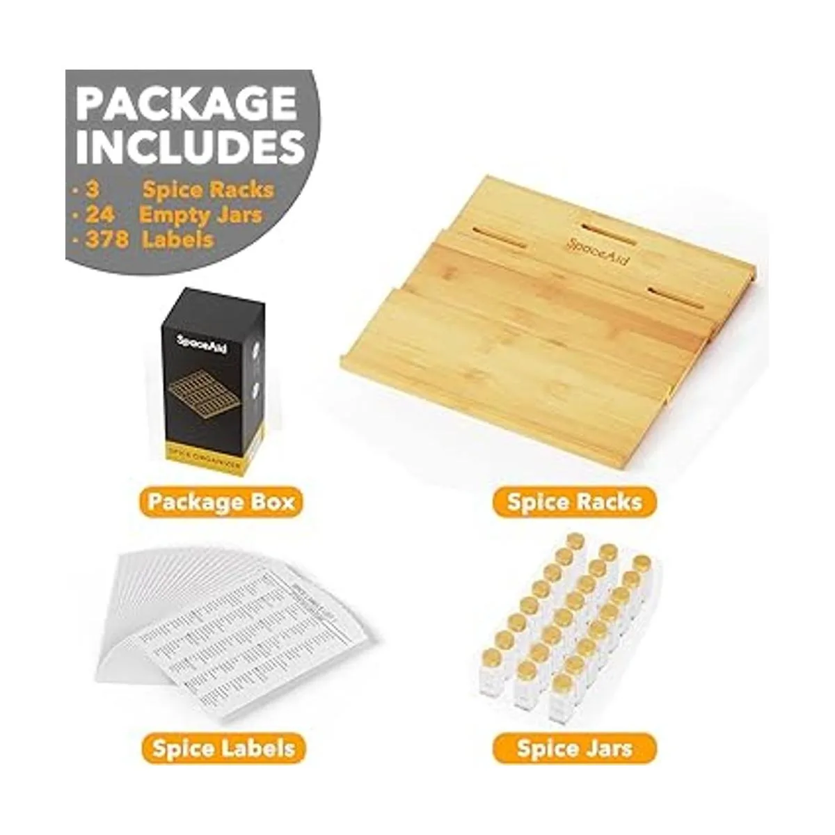 SpaceAid Organizador de cajones de especias de bambú con 24 tarros de especias, 378 etiquetas minimalistas blancas para especias, bandeja de condimento de 3 niveles para cajones de cocina, 15 pulgadas de ancho x 15 pulgadas de profundidad x 2.6 pulgadas de alto