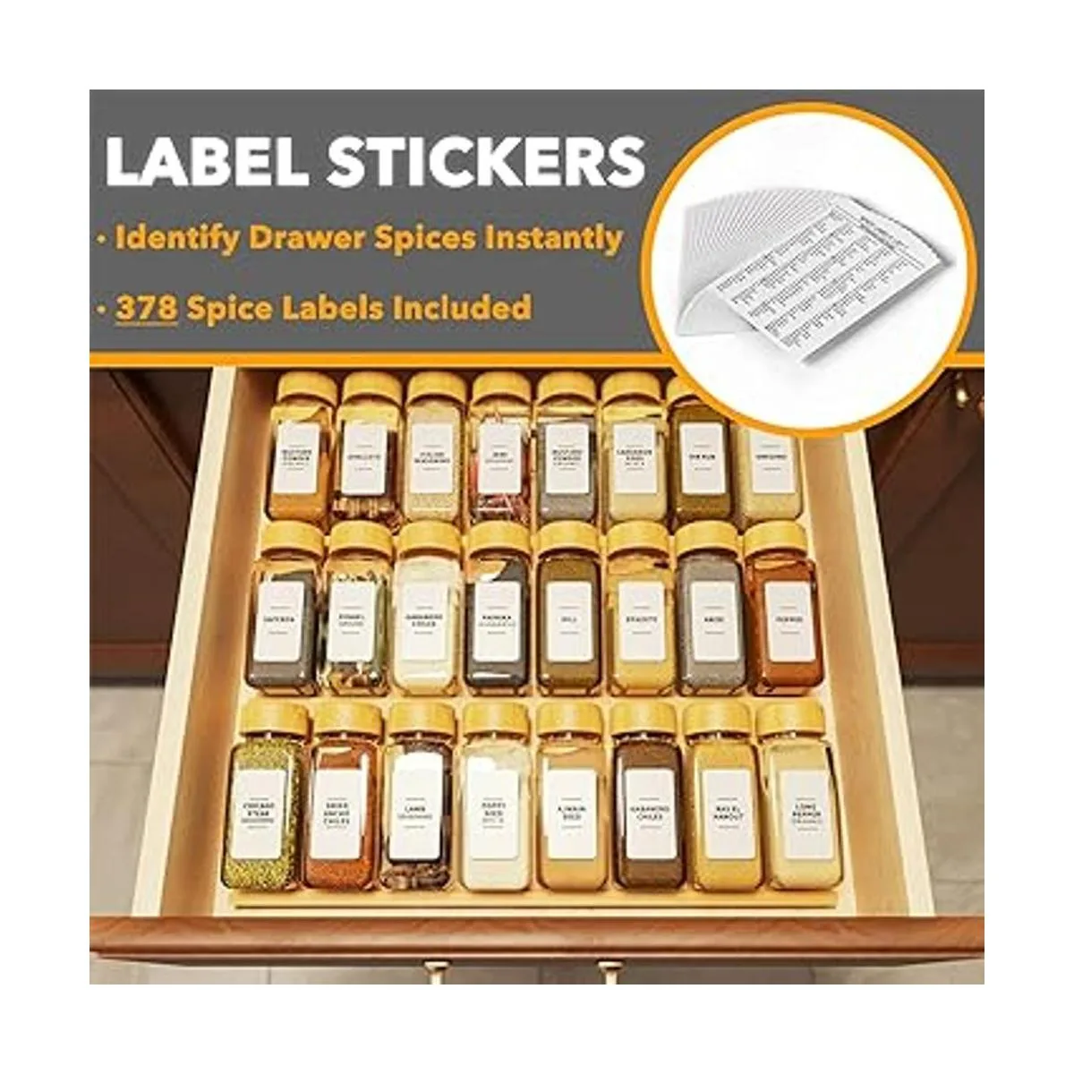 Juego organizador de especias para cajones de bambú: 1 estante para especias para cajones, 24 tarros cuadrados vacíos de vidrio para especias, 378 etiquetas minimalistas blancas para especias