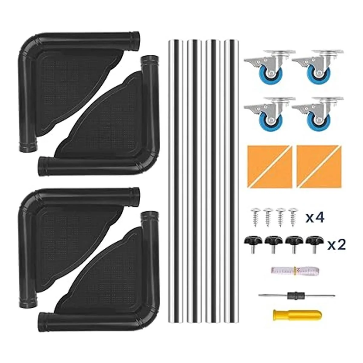 Parámetros del producto: altura de la plataforma rodante de 33/4 pulgadas. Límite de peso: 299.8 lbs. Mini accesorios para nevera: 4 ruedas giratorias de bloqueo, 4 piezas de esquina de PVC resistentes, 4 postes de acero resistentes y herramienta de tornillo. Aviso de instalación: simplemente gira y empuja en el agujero después de tomar un tubo de acero para alinear el agujero.