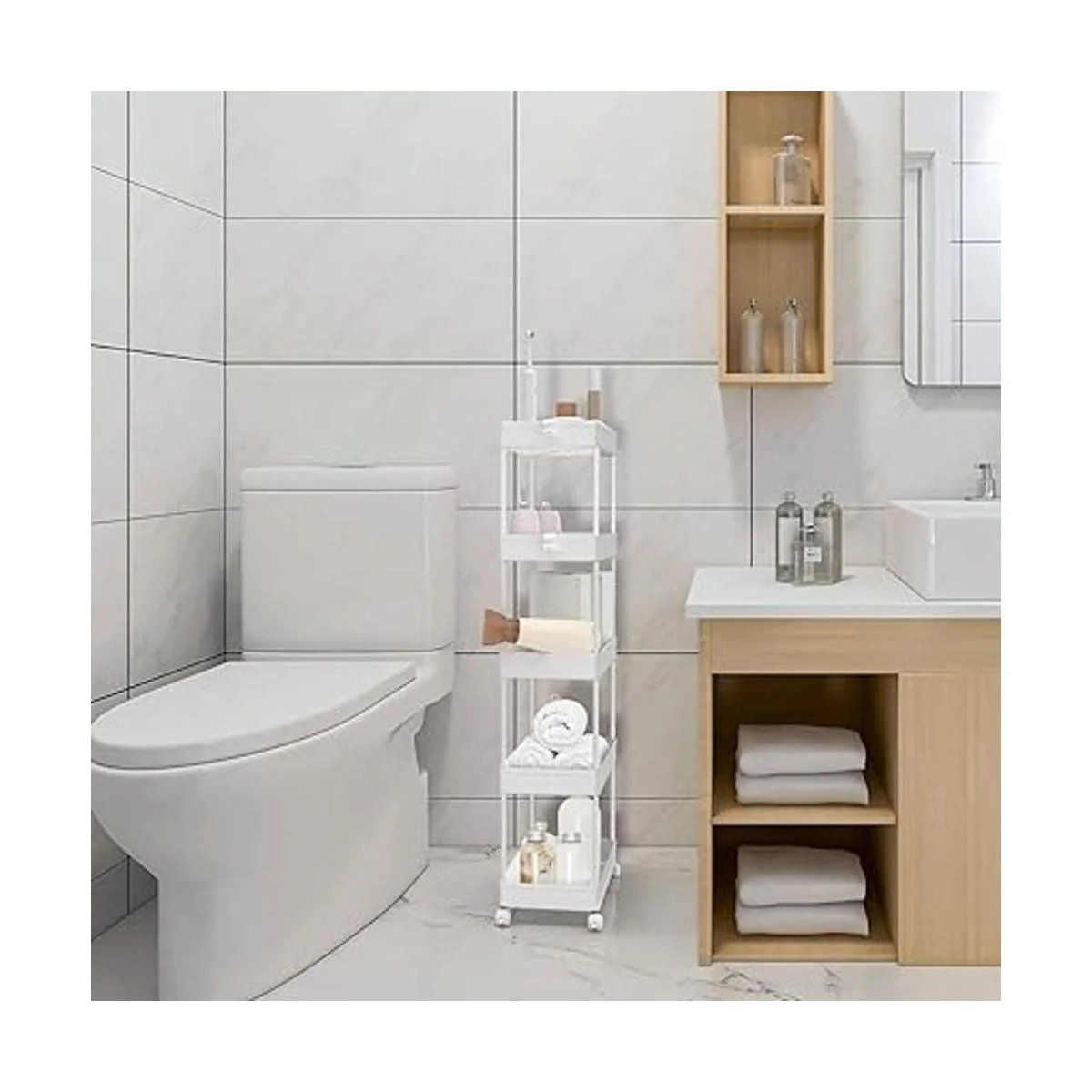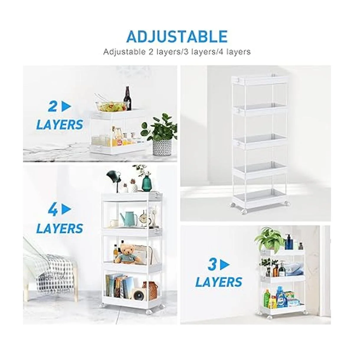2 o 3 estantes ajustables El carrito de almacenamiento rodante se puede ajustar a 2 o 3 estantes para encimeras de baño y cocina sin ruedas, por lo que amplia gama de aplicaciones
