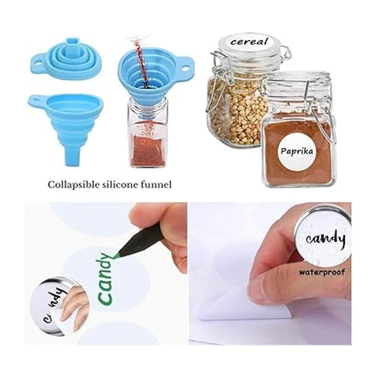 Tarros de especias de alta calidad: paquete de 12 tarros de especias Mason de 4 onzas con tapas herméticas con bisagras y junta de goma, que está hecho de materiales de la más alta calidad para una máxima durabilidad y comodidad. Cada juego viene con 12 etiquetas de especias y embudos de silicona.