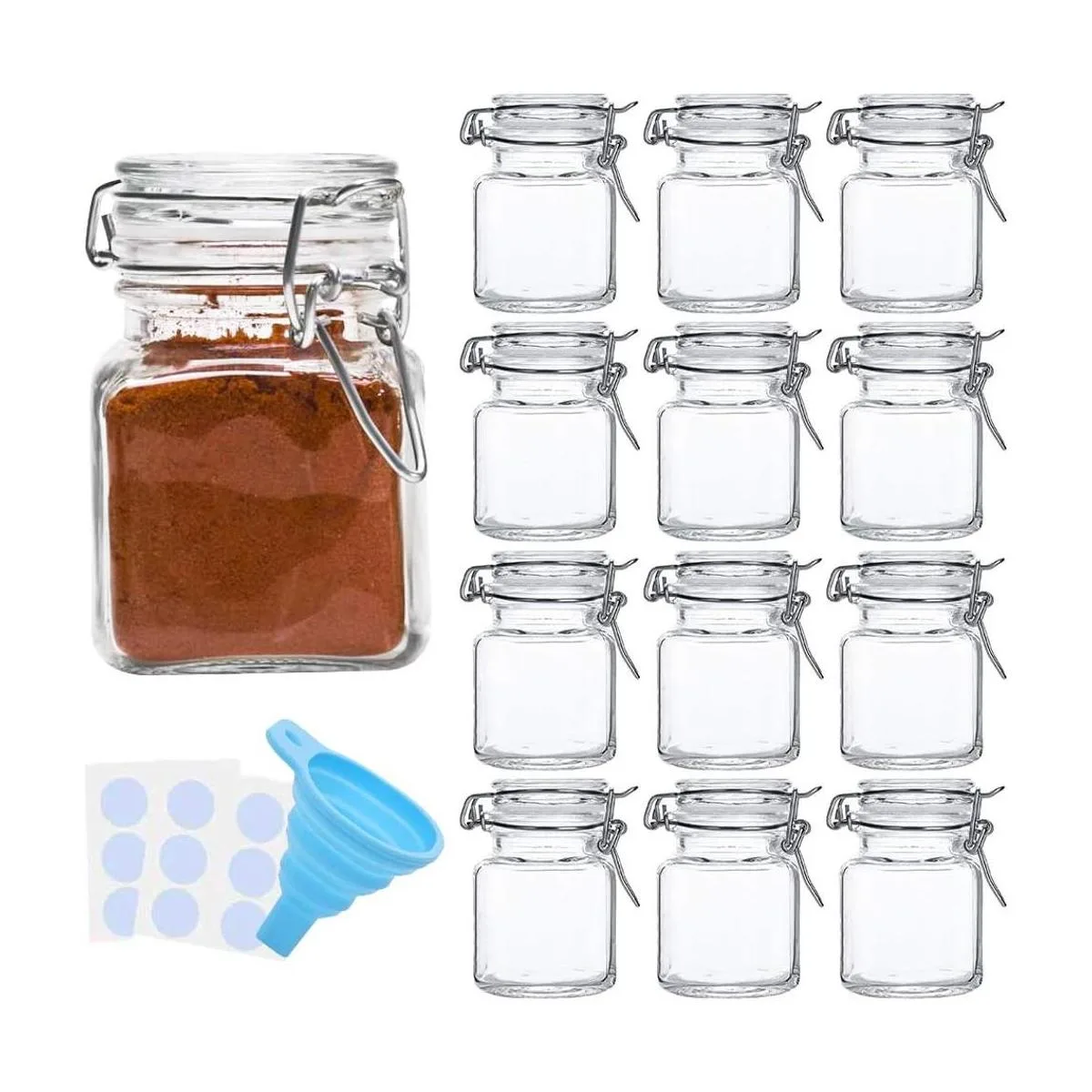 Spanla Tarros de especias, paquete de 12 tarros de vidrio pequeños de 4 onzas con tapa hermética con bisagras, con 12 etiquetas de especias y embudos de silicona, tarros de vidrio herméticos para especias, almacenamiento de manualidades de arte paquete de 12