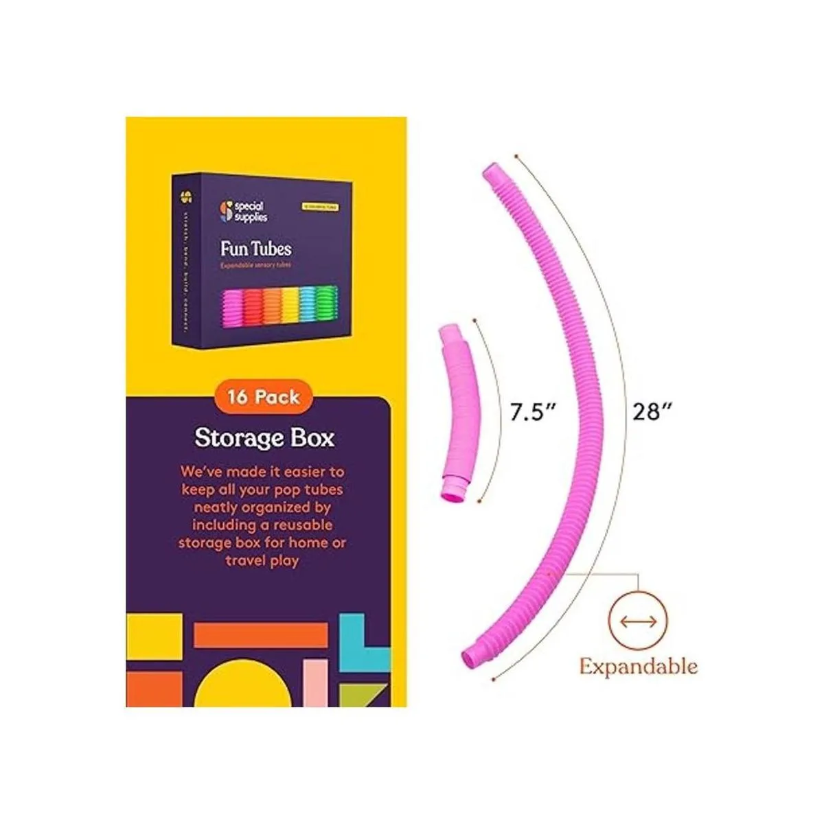 Caja de almacenamiento: hemos hecho que sea más fácil mantener todos tus divertidos tubos perfectamente organizados incluyendo una pequeña caja de almacenamiento portátil para el hogar o para jugar de viaje.
