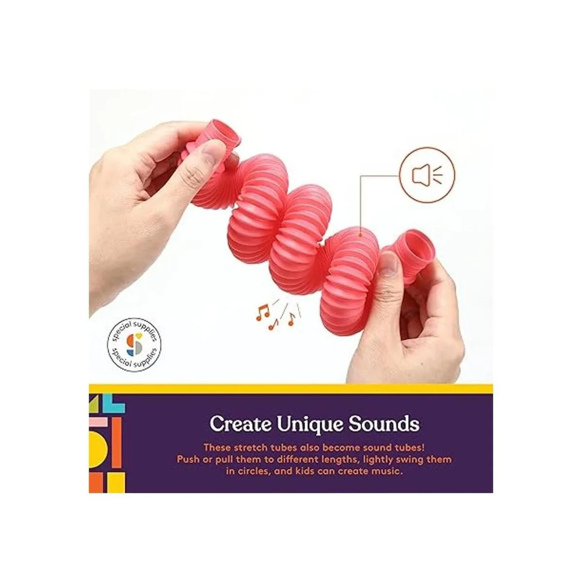 Crea sonidos únicos: estos tubos elásticos también se convierten en tubos de sonido. Empuja o tira de ellos a diferentes longitudes, gíralos ligeramente en círculos, y los niños pueden crear música.