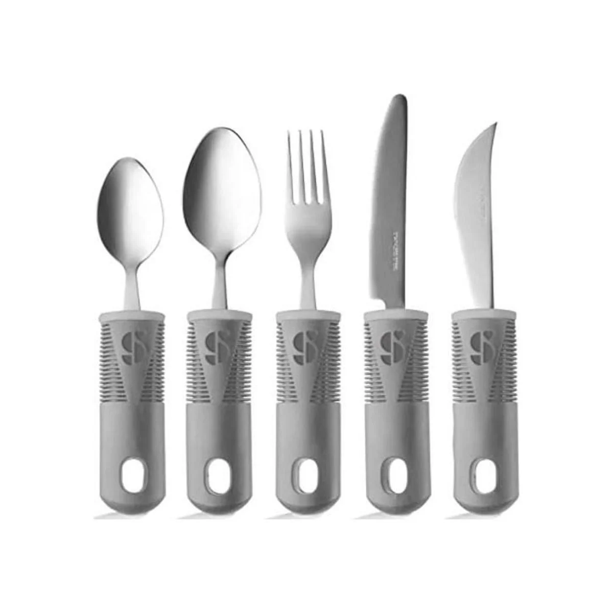 Special Supplies Utensilios adaptativos juego de cocina de 5 piezas anchos, sin peso, asas antideslizantes para temblores de manos, artritis, parkinson o ancianos, cuchillos de acero inoxidable, tenedor y cucharas, color gris