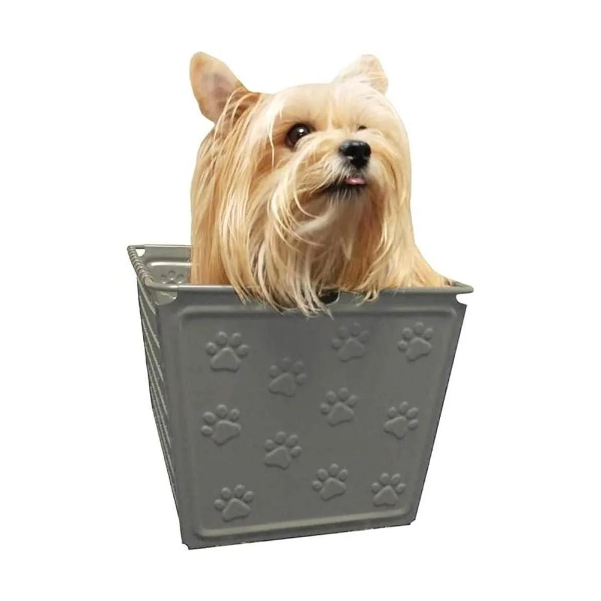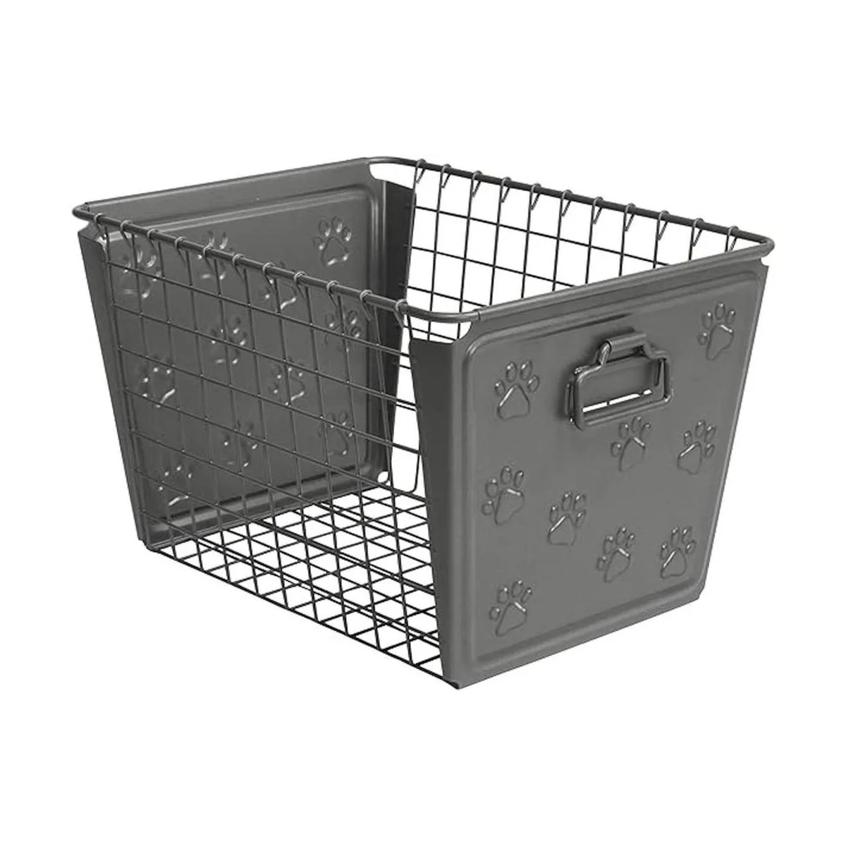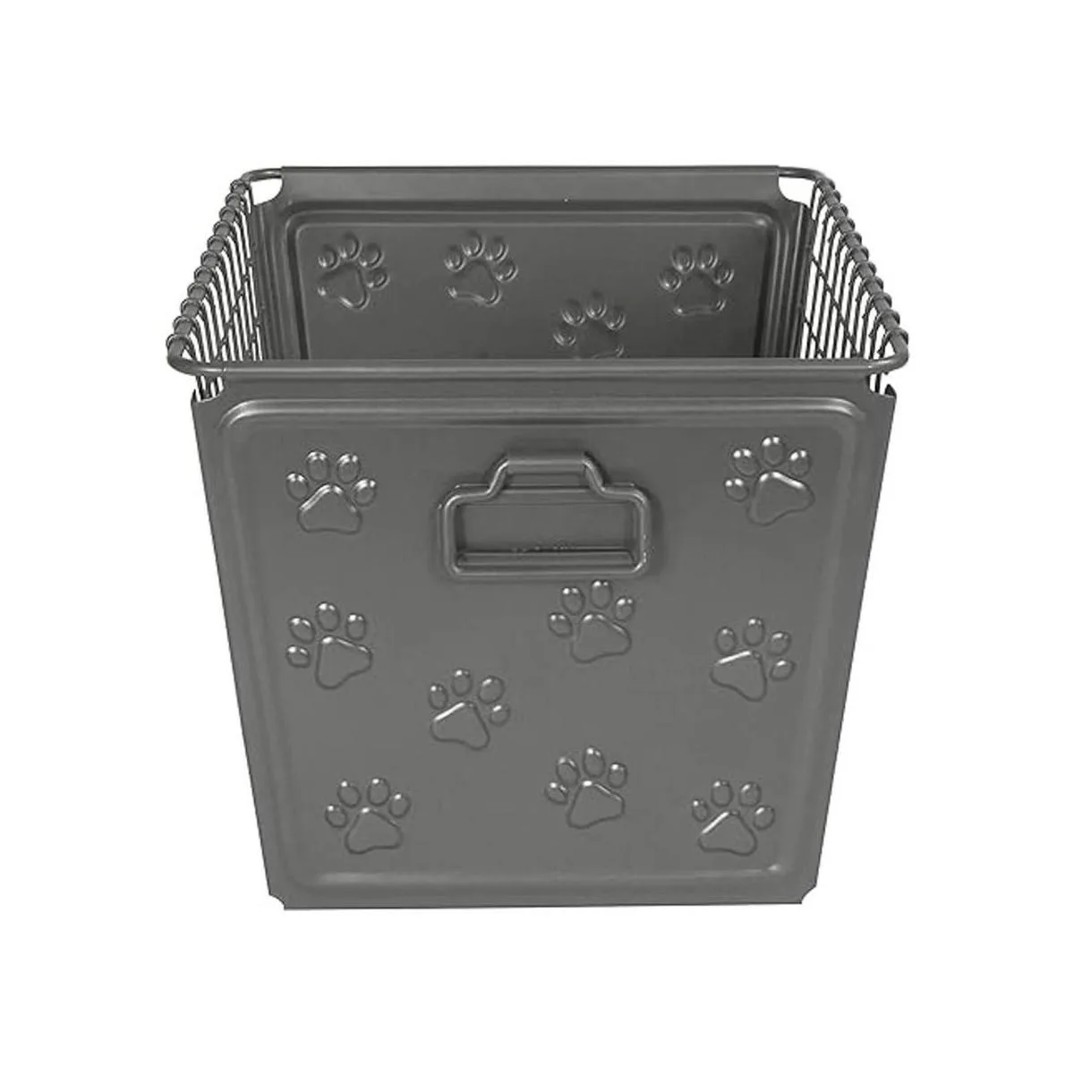 Spectrum Diversified Paws Macklin Basket Cubo de almacenamiento de acero con bonito diseño de huellas dactilares, organizador de accesorios para mascotas con acabado resistente al óxido, organización y almacenamiento de juguetes para gatos y perros, mediano, gris industrial