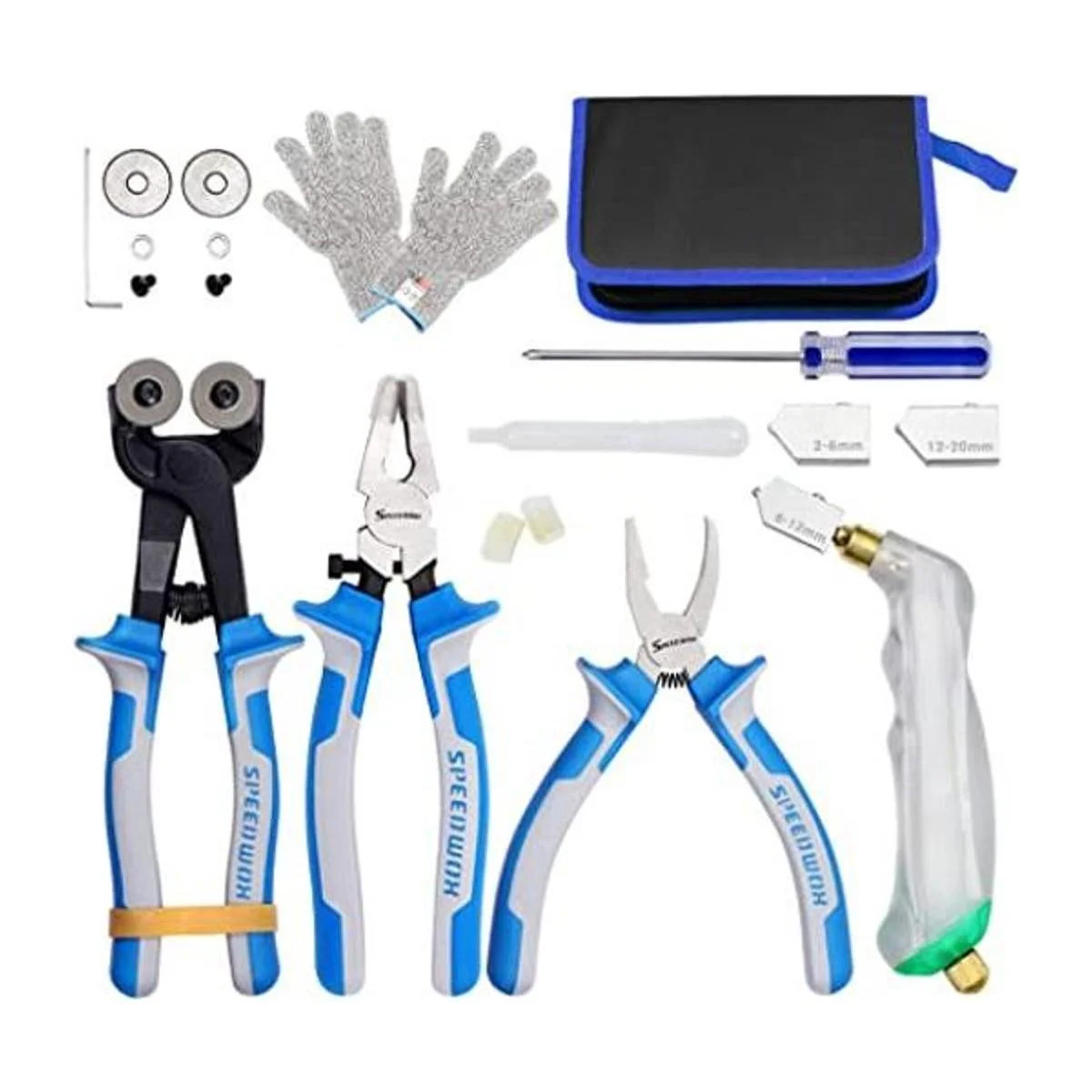 SPEEDWOX Juego de 20 pinzas de vidrio con ruedas de mosaico resistentes con rueda de corte de repuesto, alicates para correr de vidrio, alicates Grozer, alicates para alimentar al aceite, guantes resistentes a los cortes y bolsa de cuero con cremallera