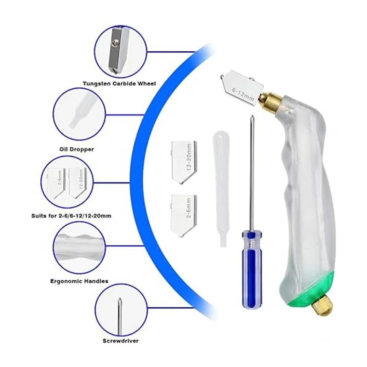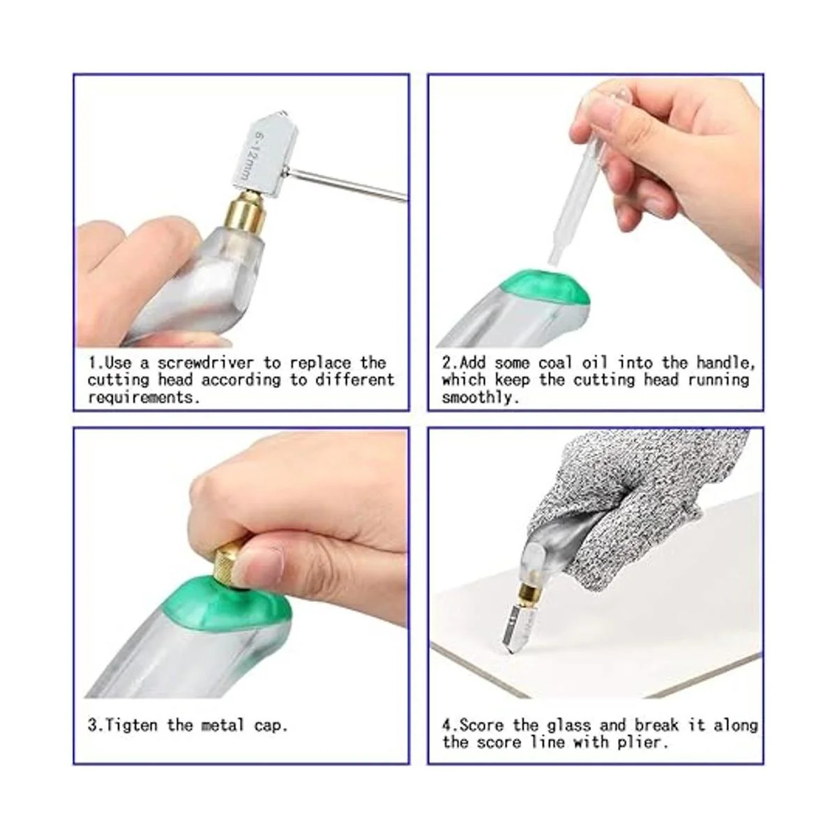 Juego de cortadores de vidrio de alimentación de aceite: cuenta con un sistema automático de dispensación de aceite que mantiene la lubricación de la rueda mientras cortas. 3 cabezales de corte de vidrio son adecuados para cortar vidrio de 2 a 0.236 in, 6 a 0.472 in, 12 a 0.787 in de grosor respectivamente.